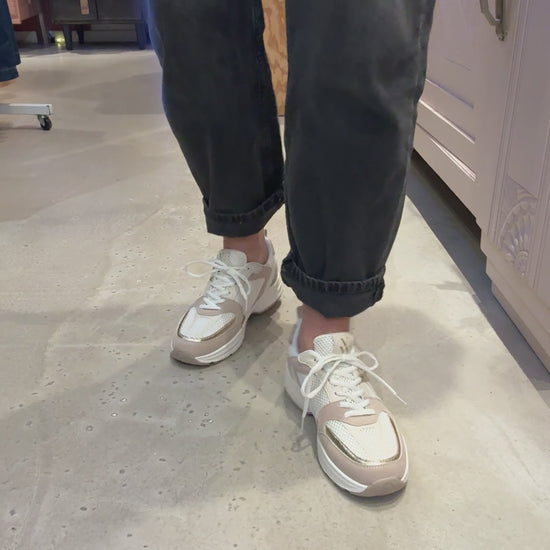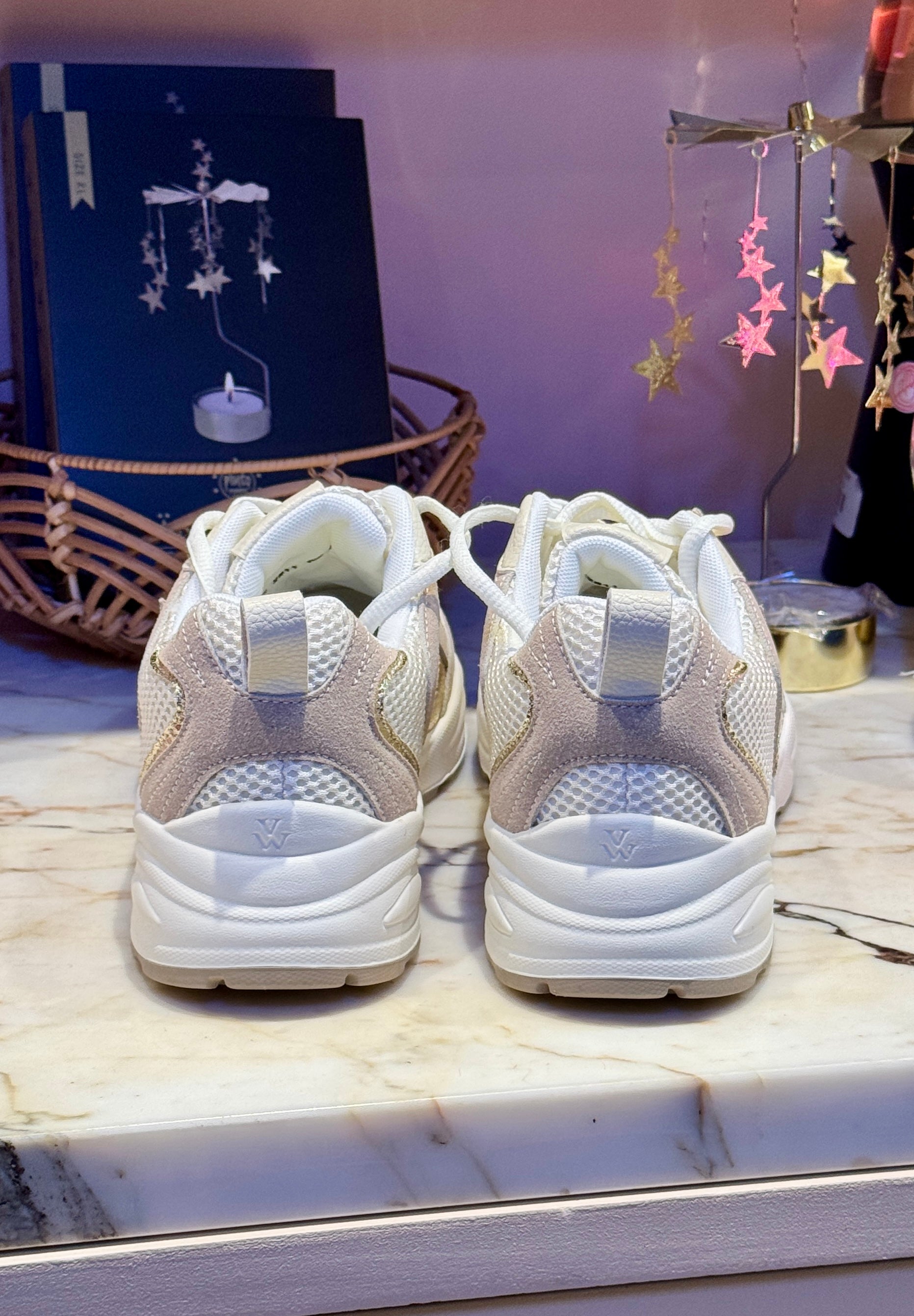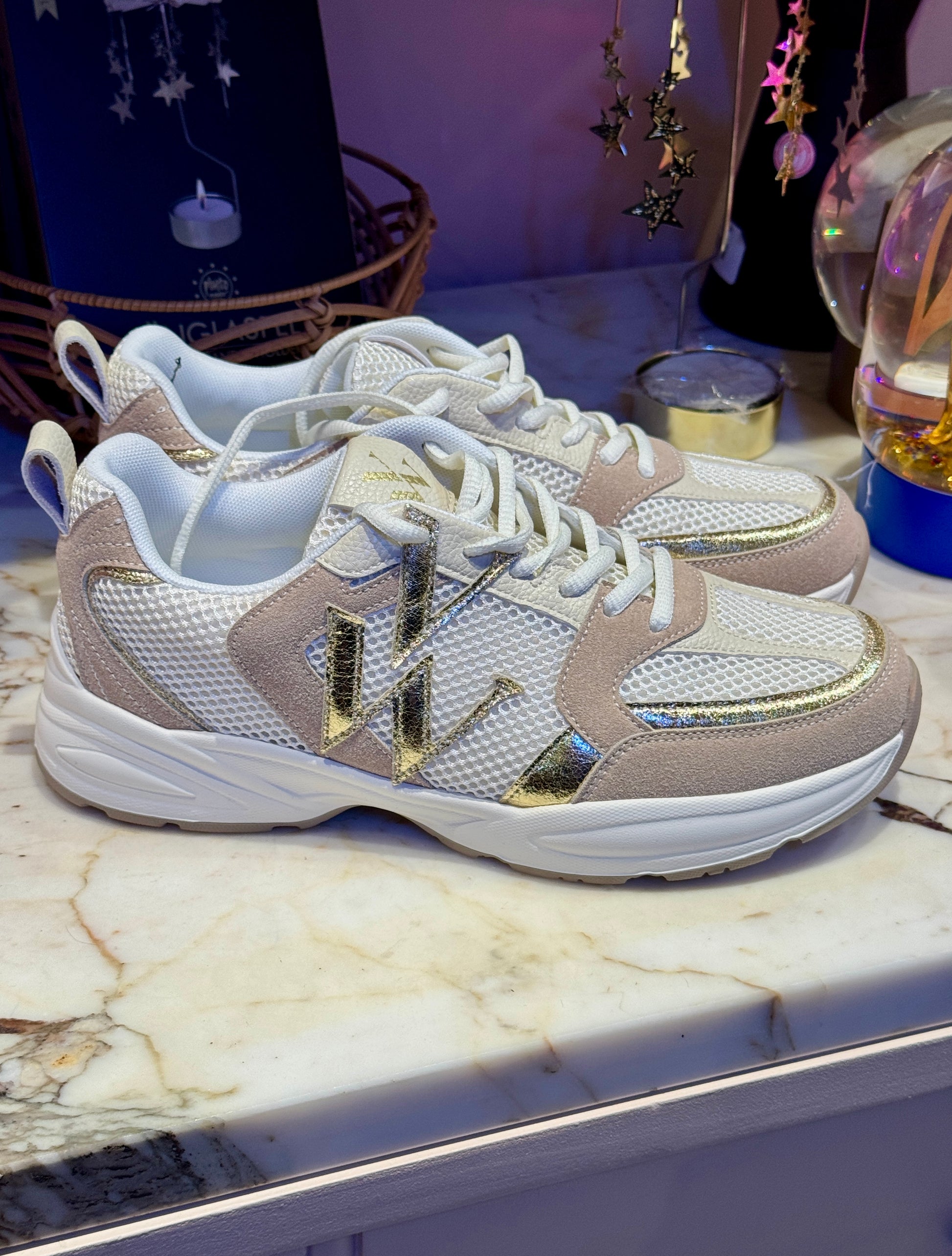 - Garants en similicuir beige clair effet grainé débordant sur l'empeigne