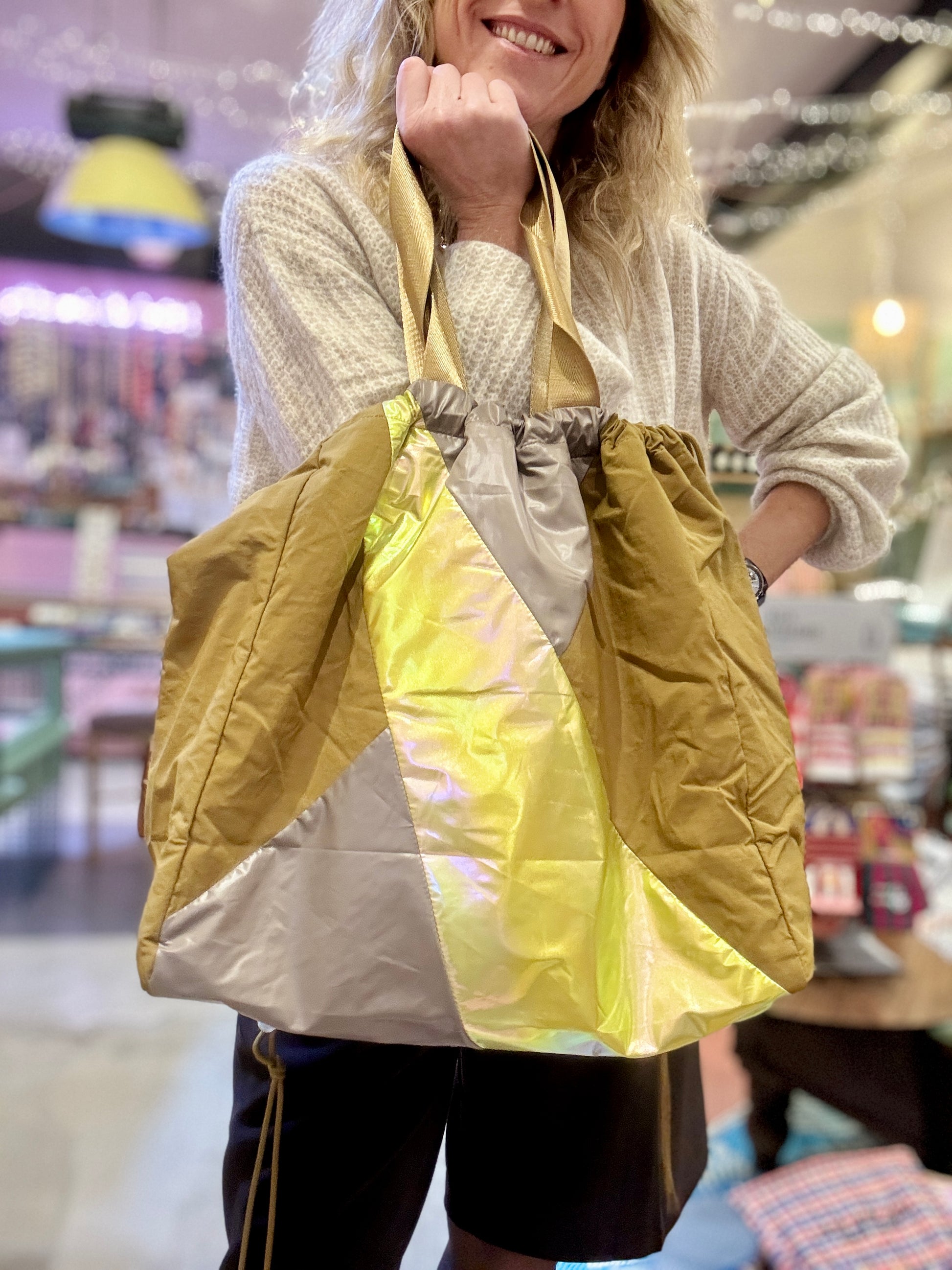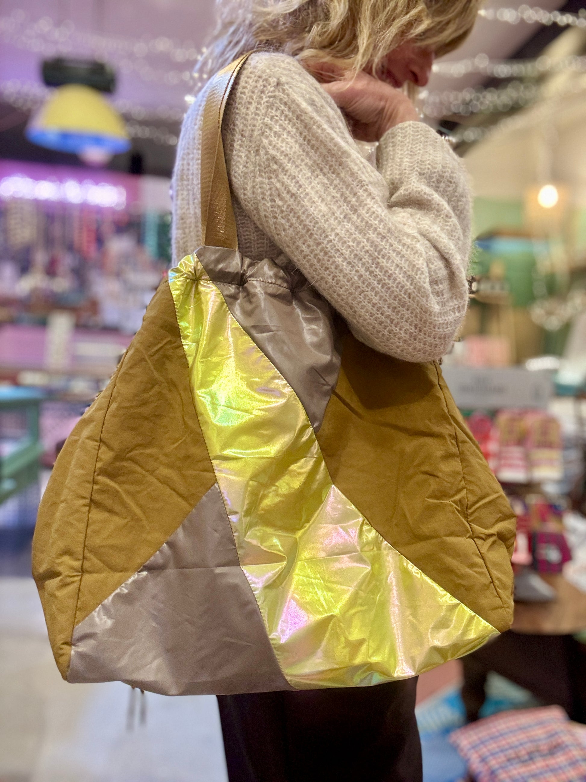 Je les adore ! Grands cabas en tissus imperméable avec découpes de tissus colorés.