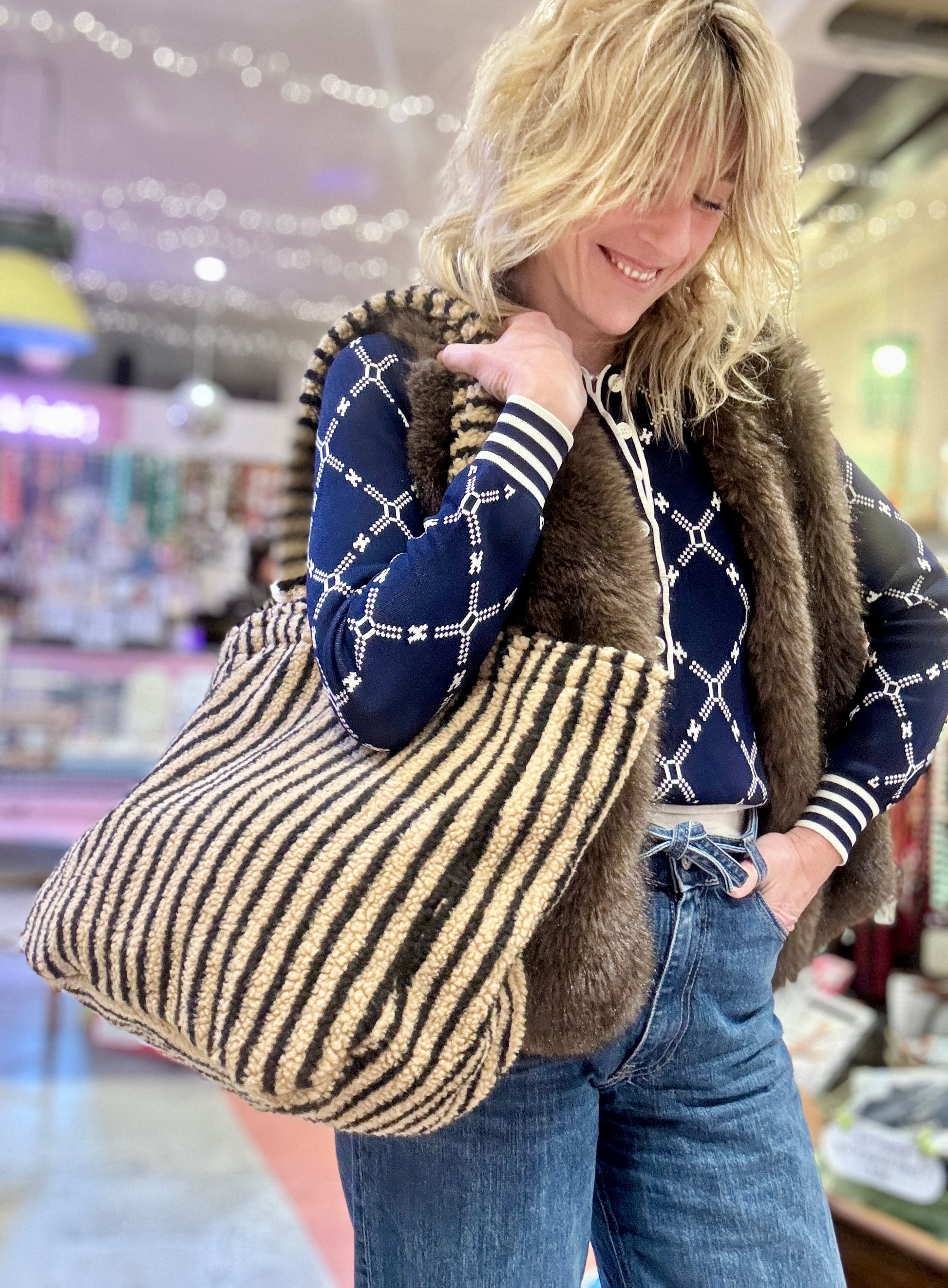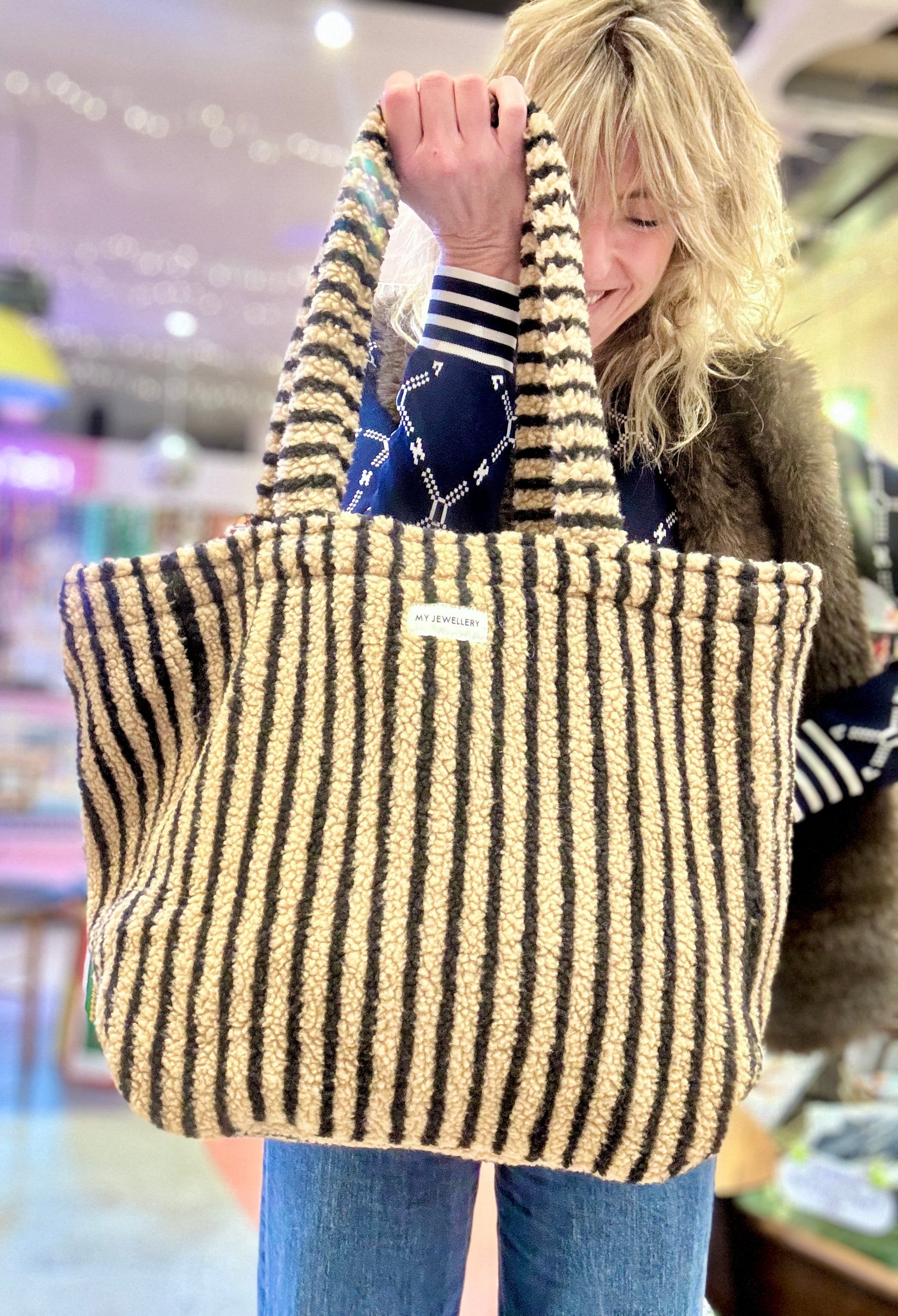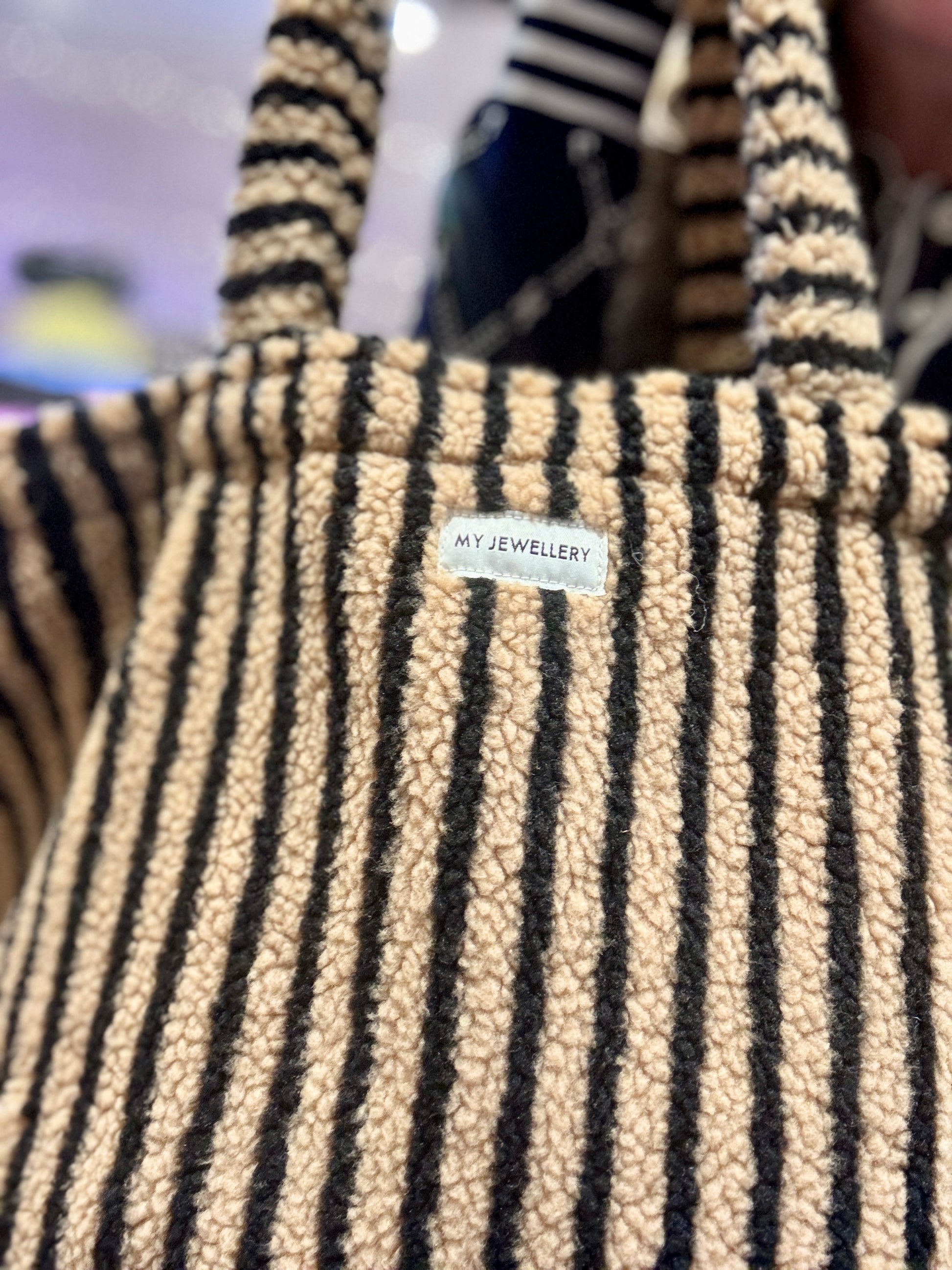 Grand cabas en moumoute à rayures rose er rouge.