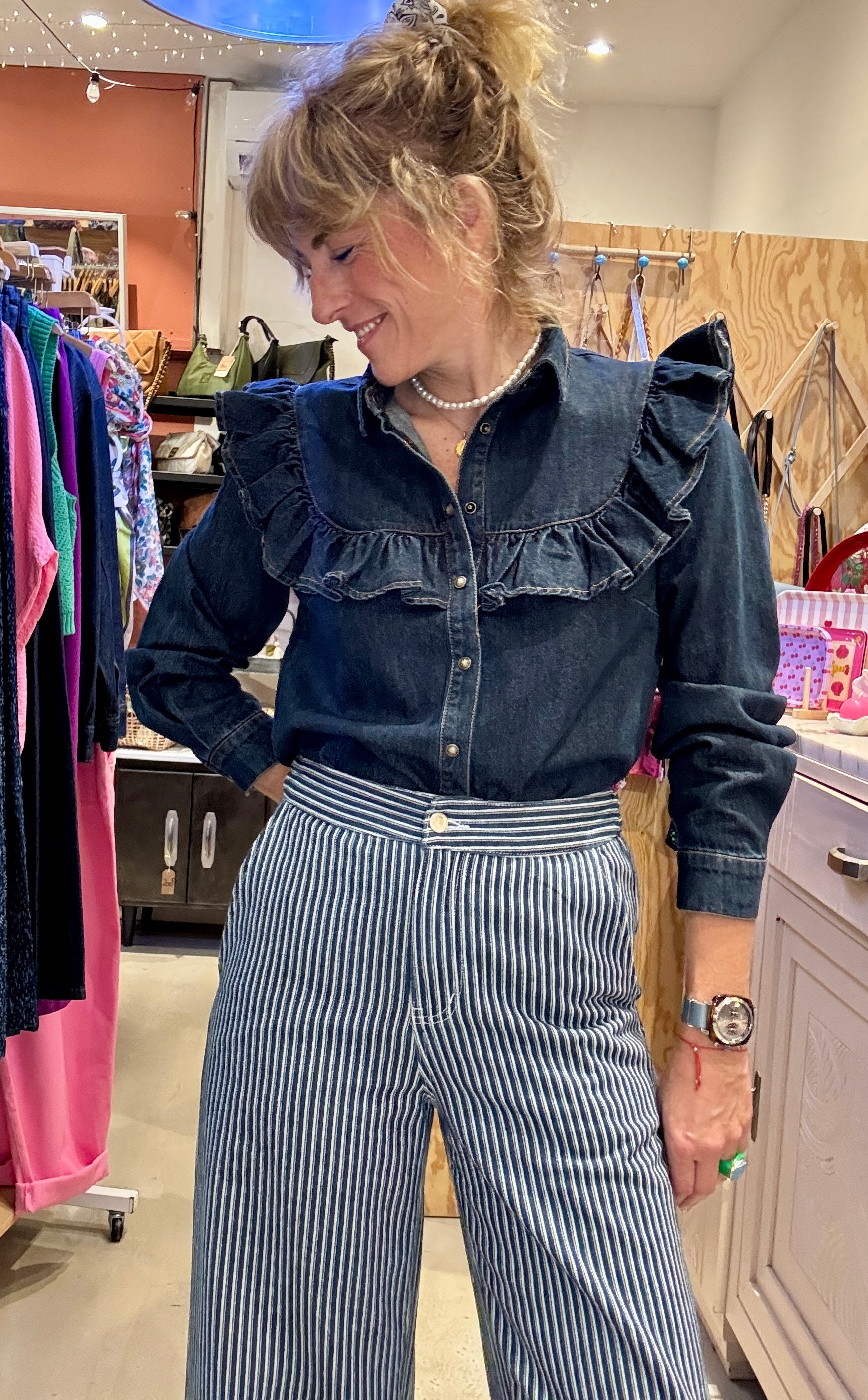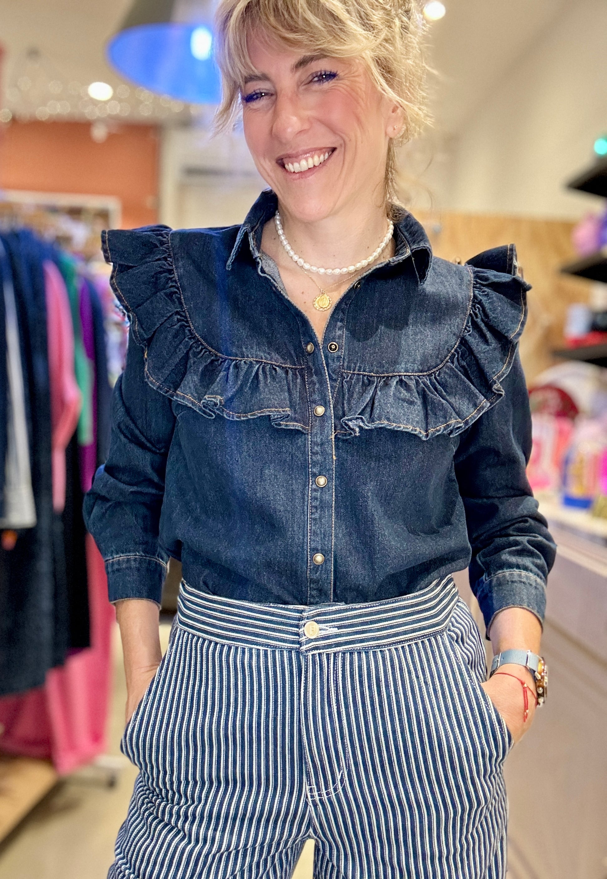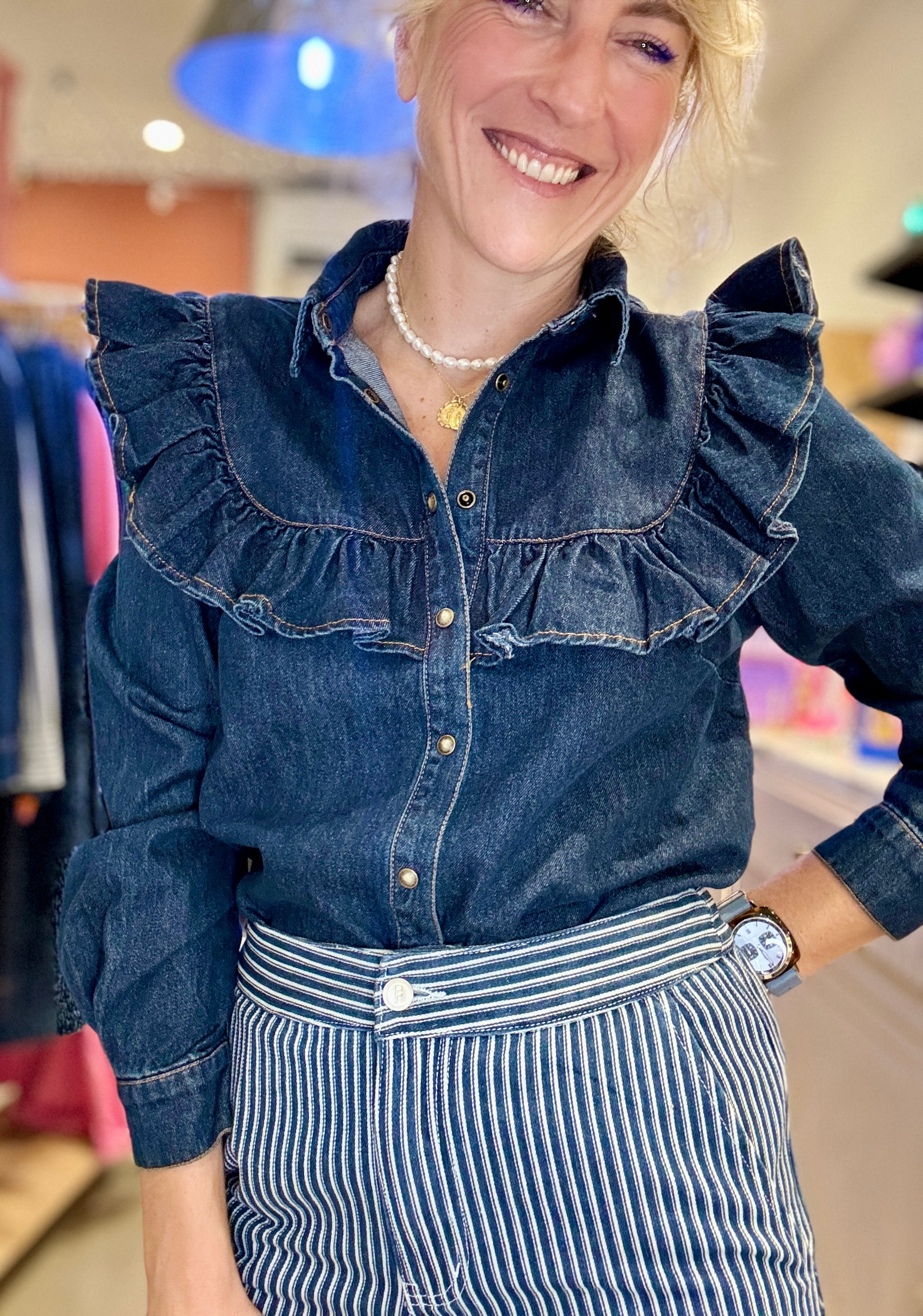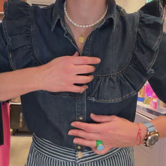 Très belle chemise en jean brut à volants.