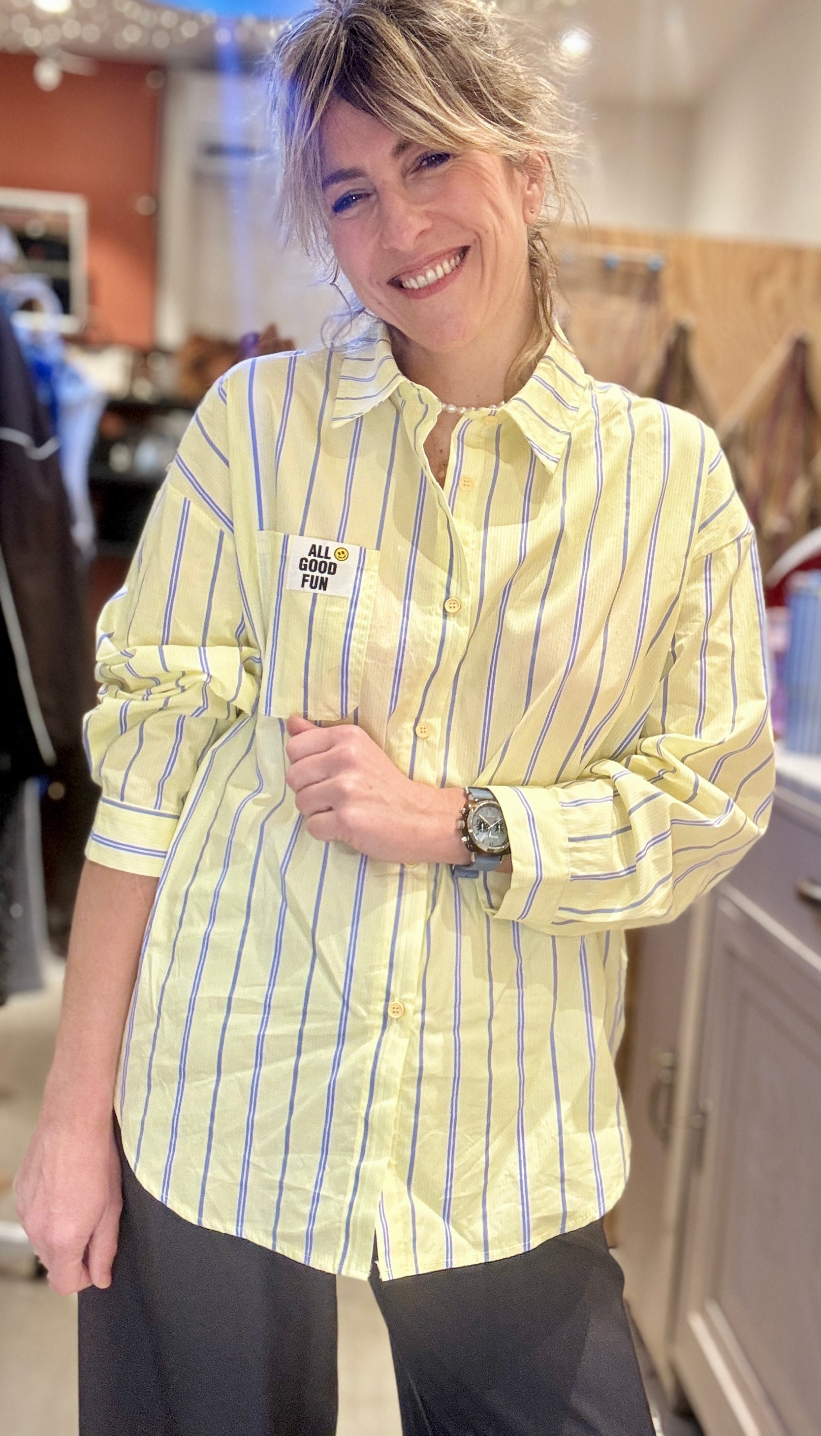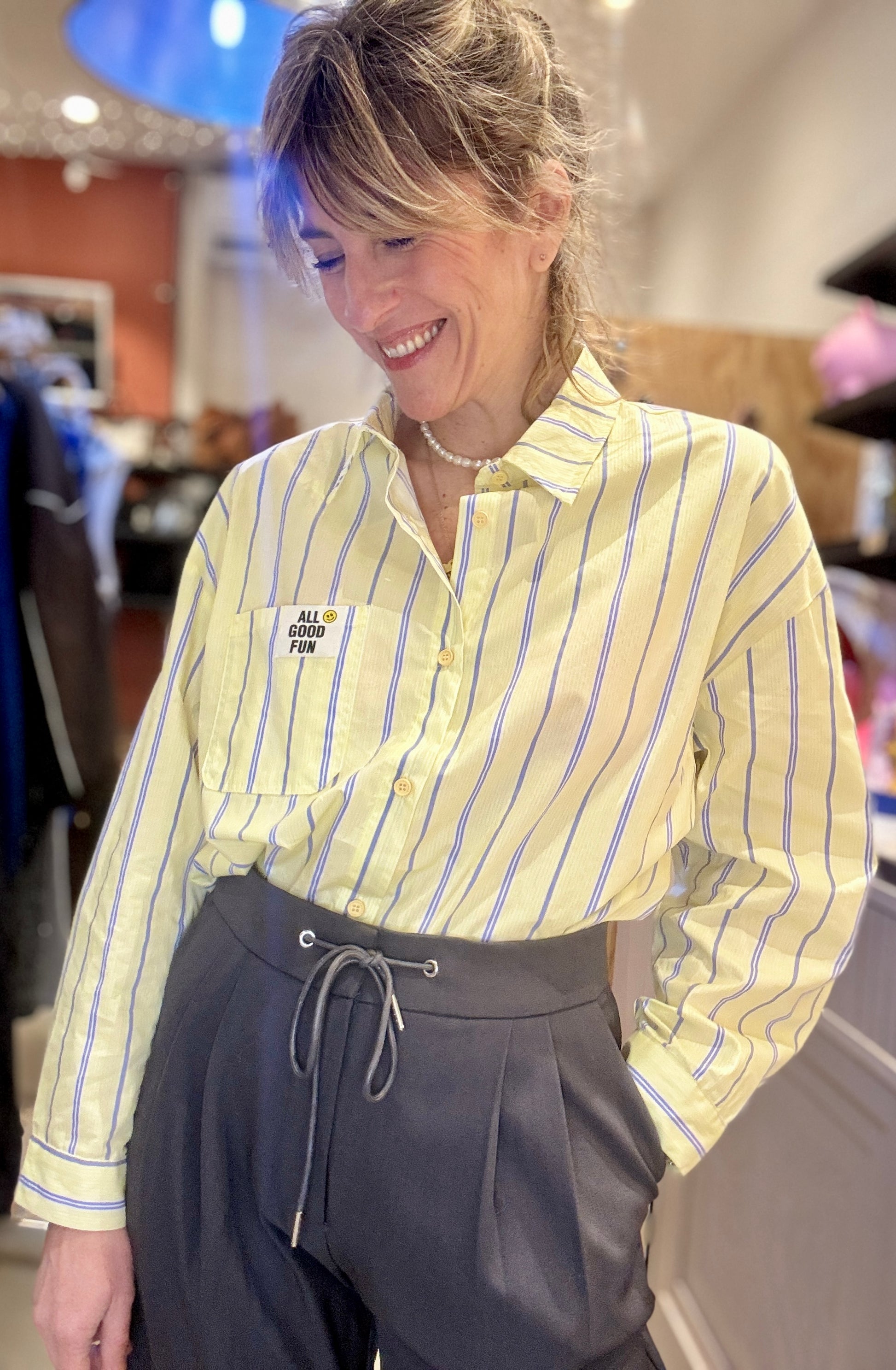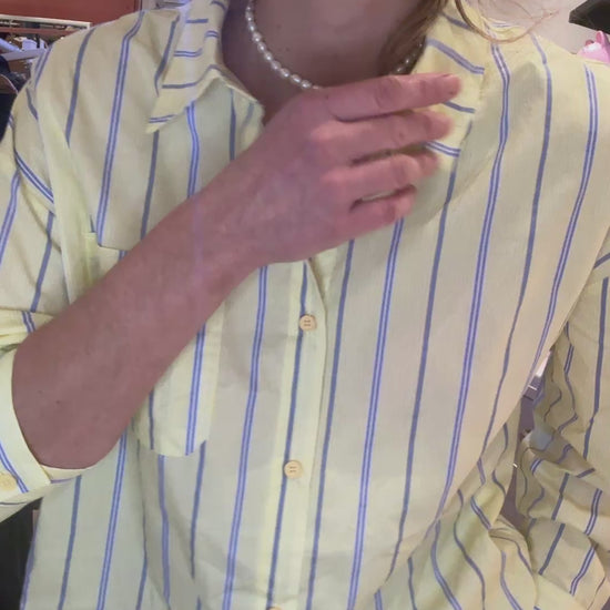 Un intemporelle à rayures jaunes et bleues avec étiquette sur la poche ^^^.