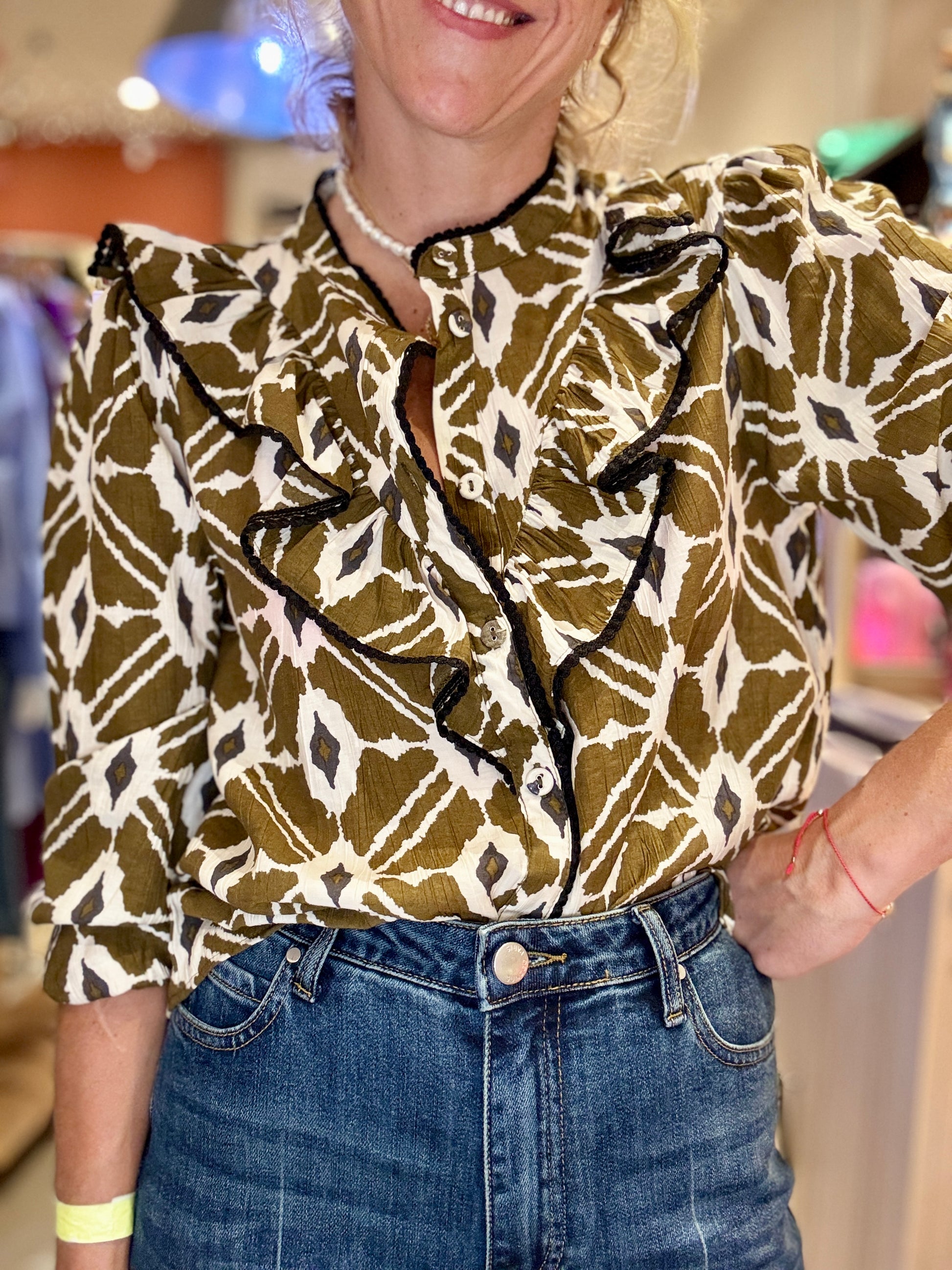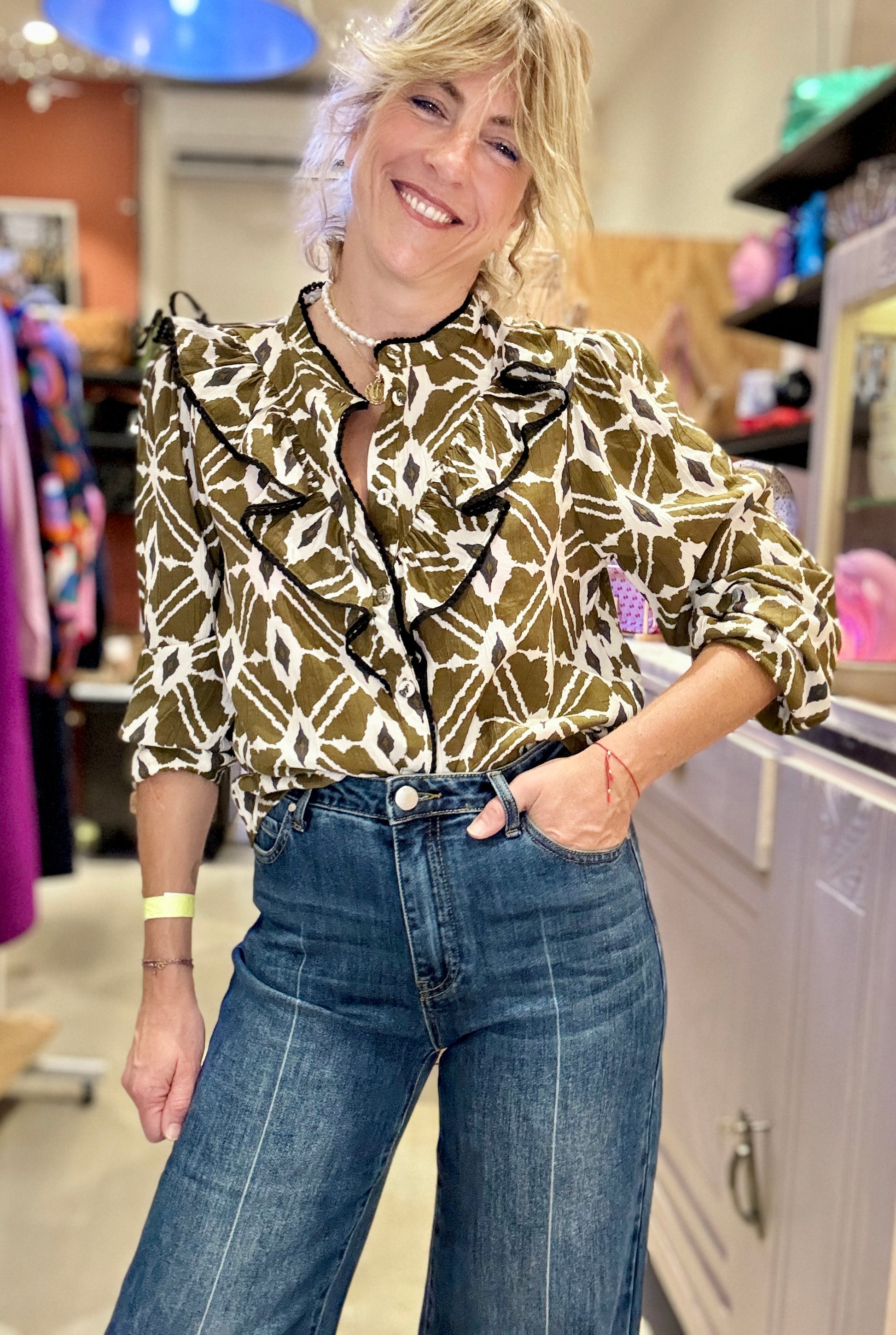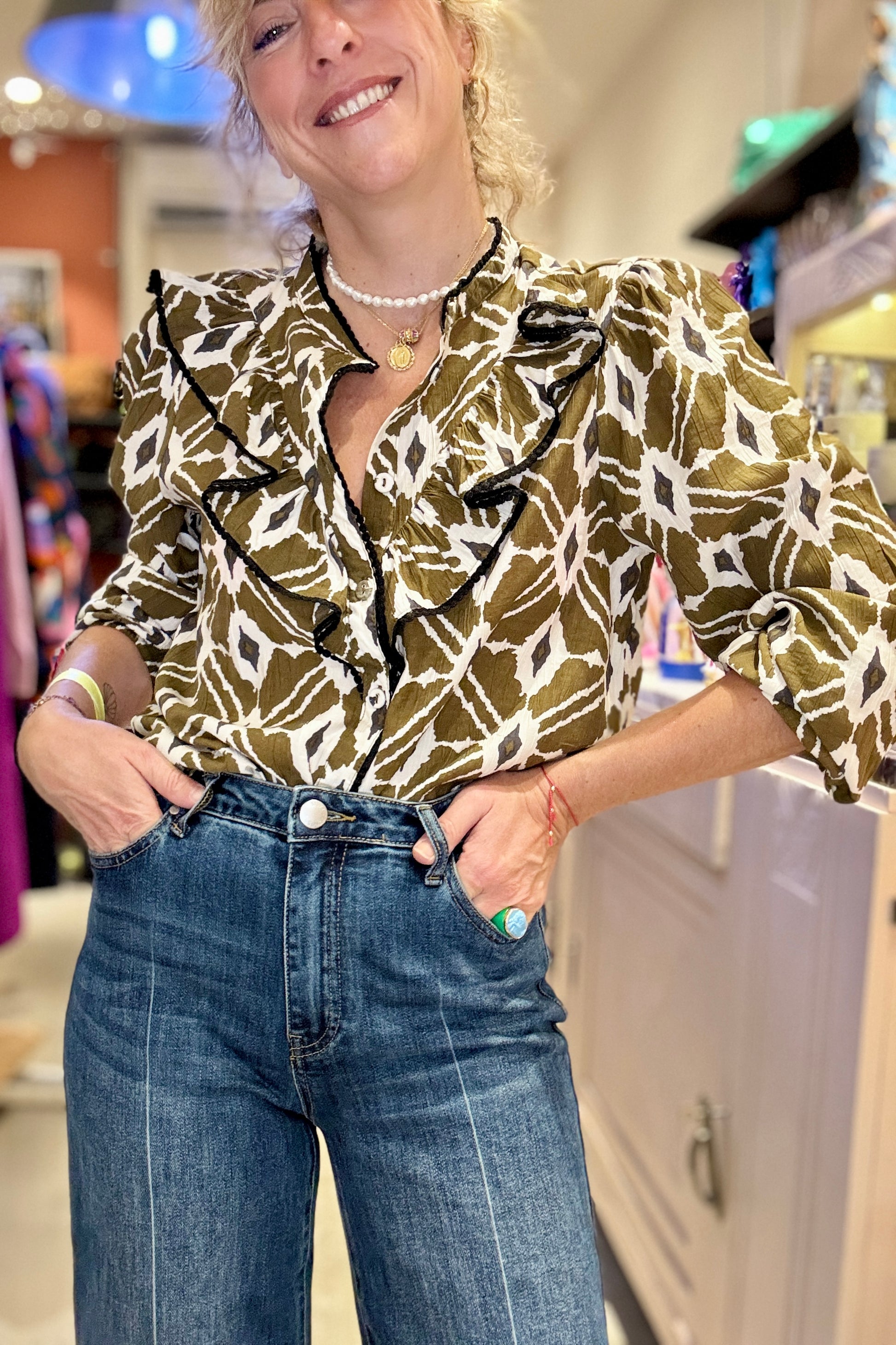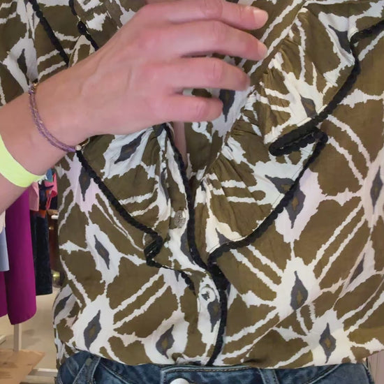 Magnifique chemise à volants imprimé Ikat dans les tons kaki.