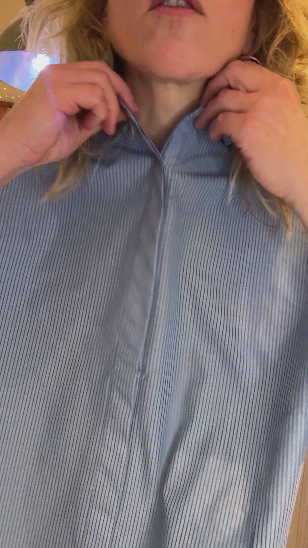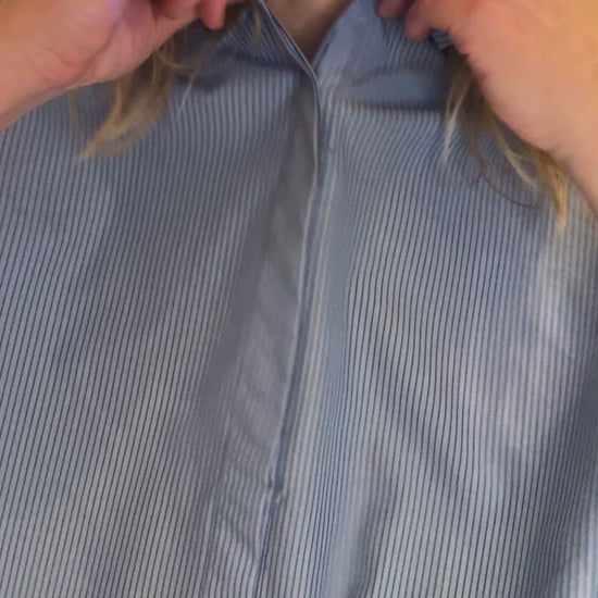 On adore sa coupe ample, ses manches ballons avec plis sur les côtés et son imprimé fines rayures blaeues.