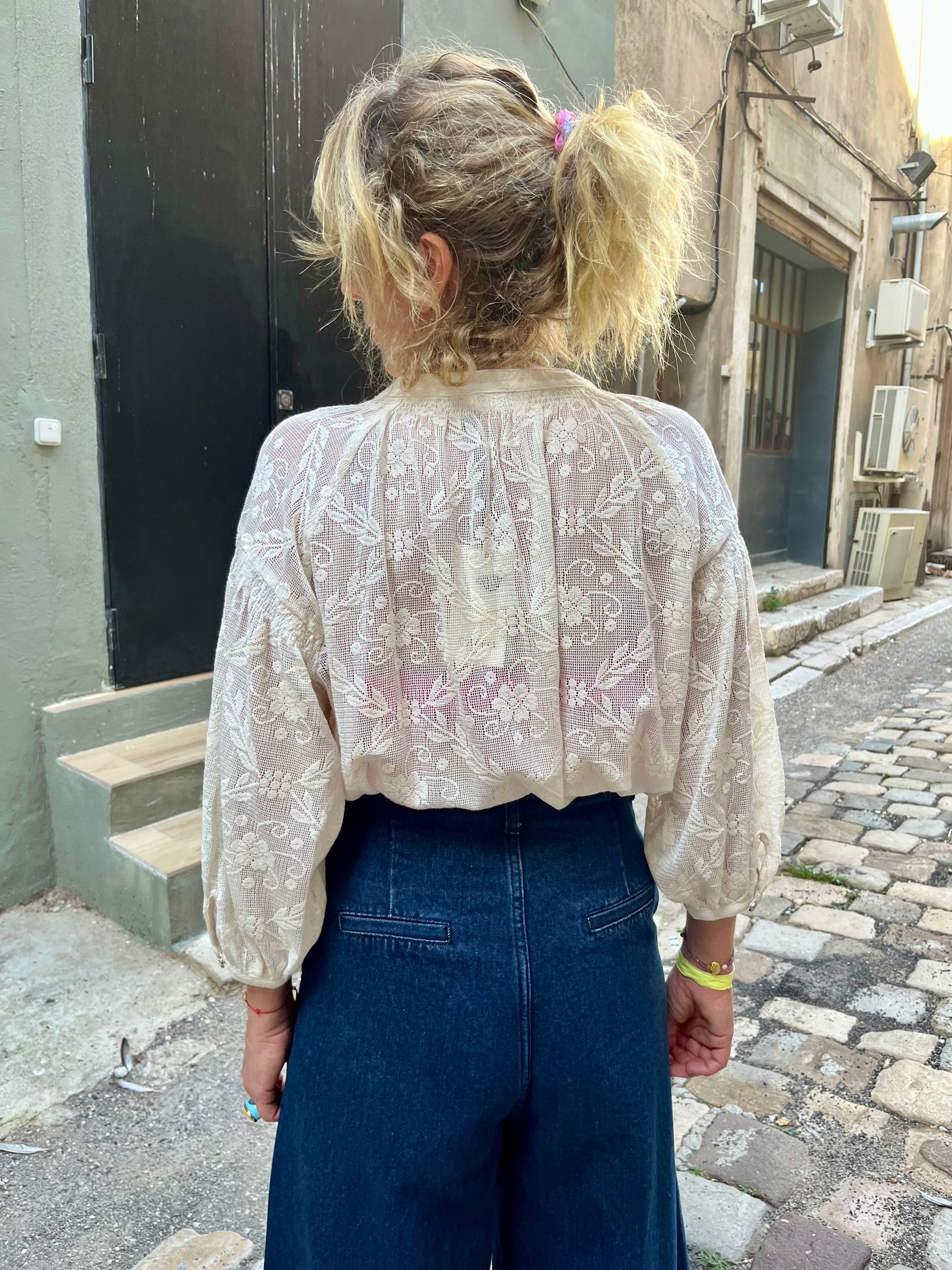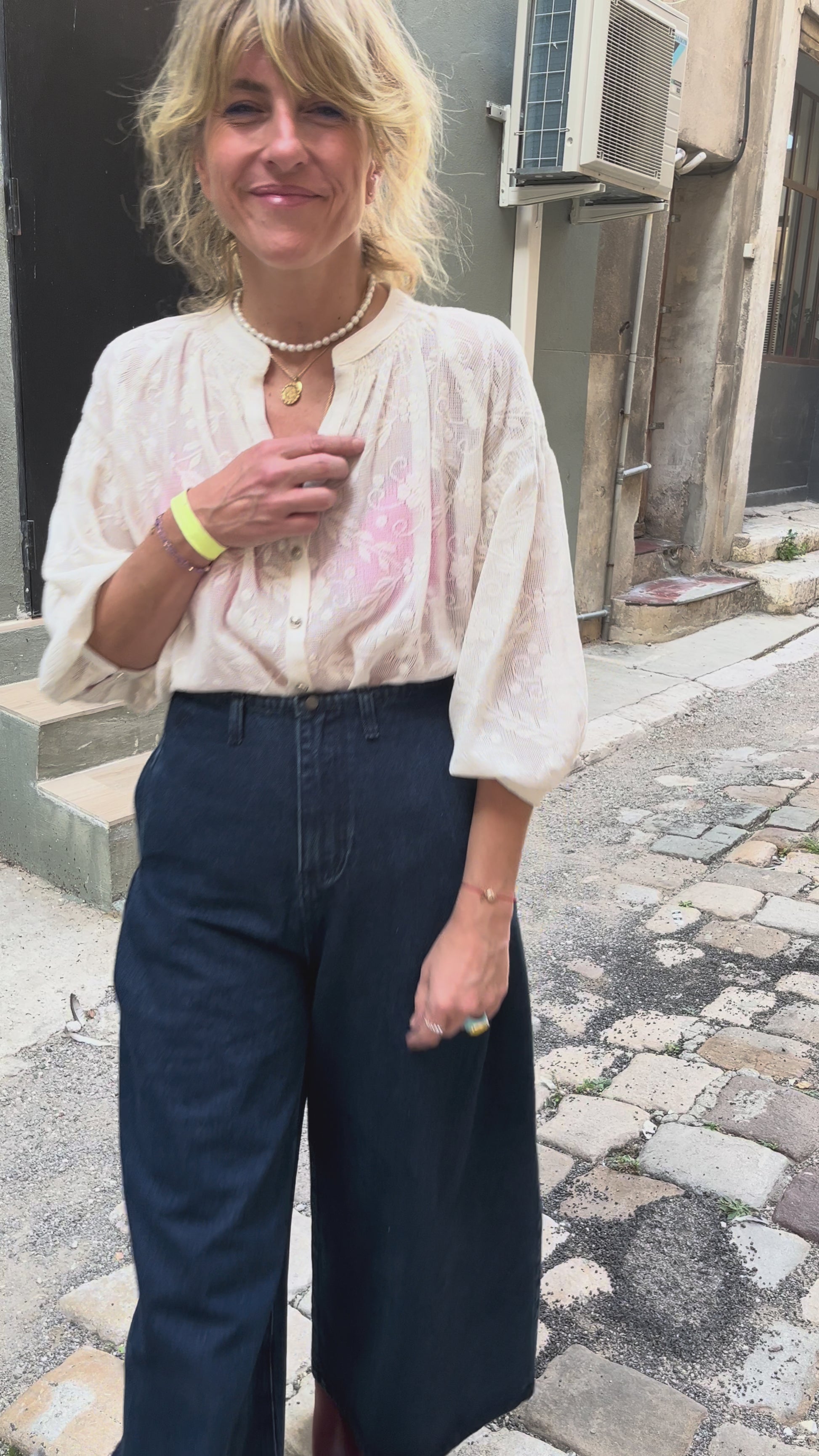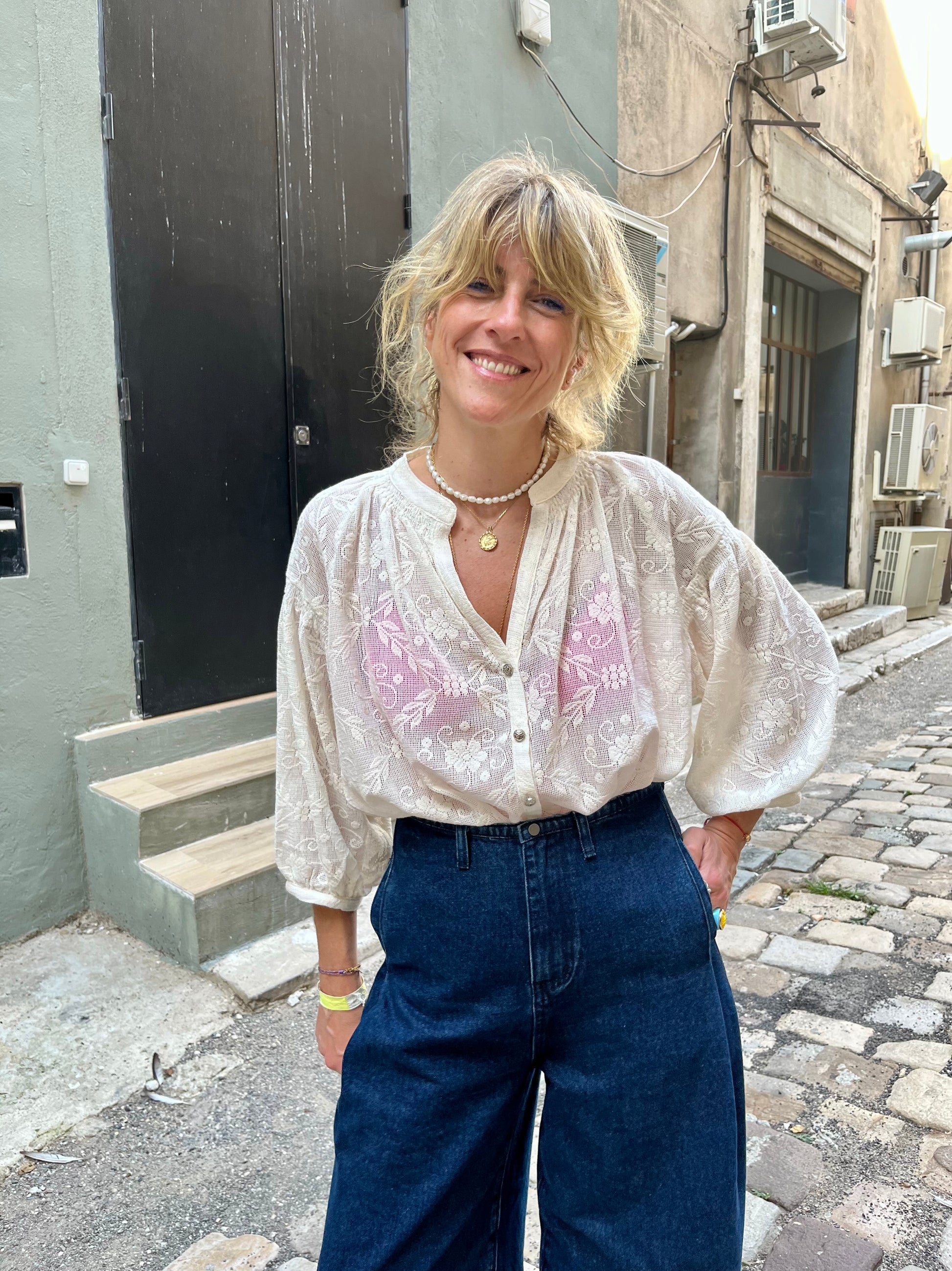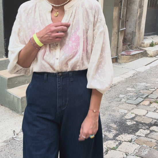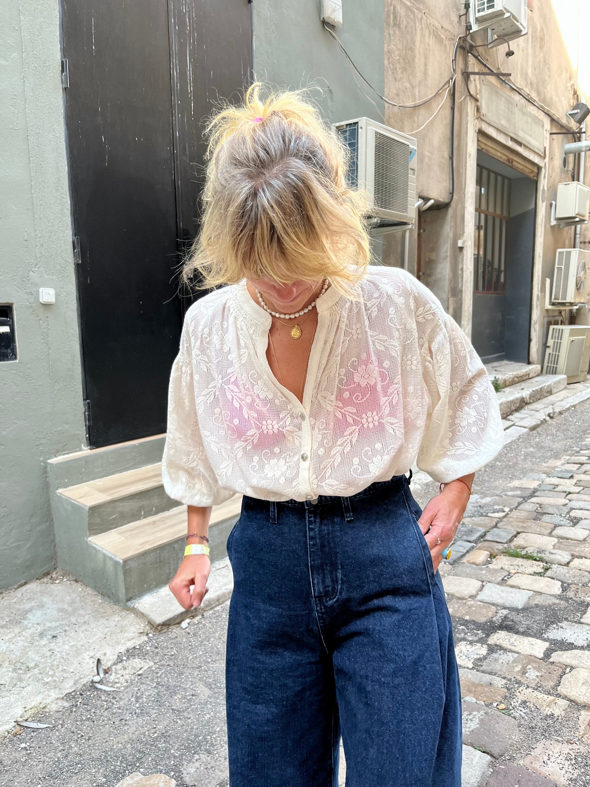 Col V, manches bouffantes courtes et jolis boutons en métal.