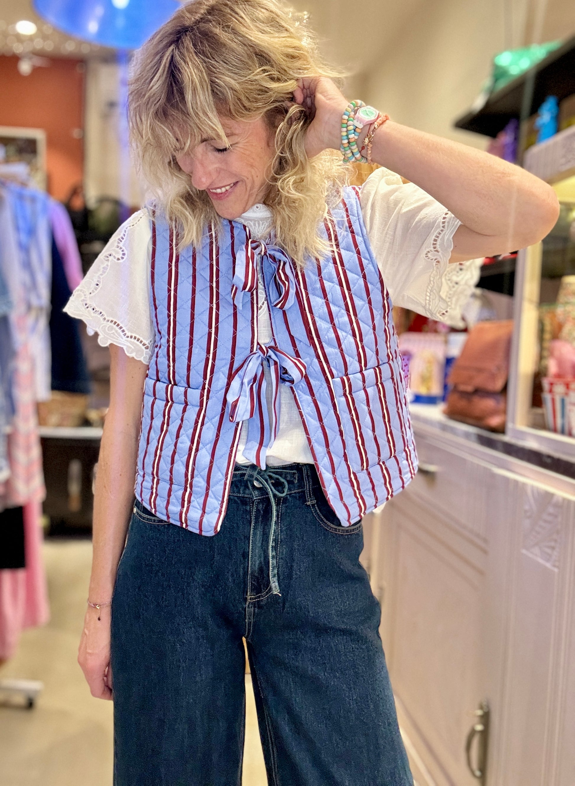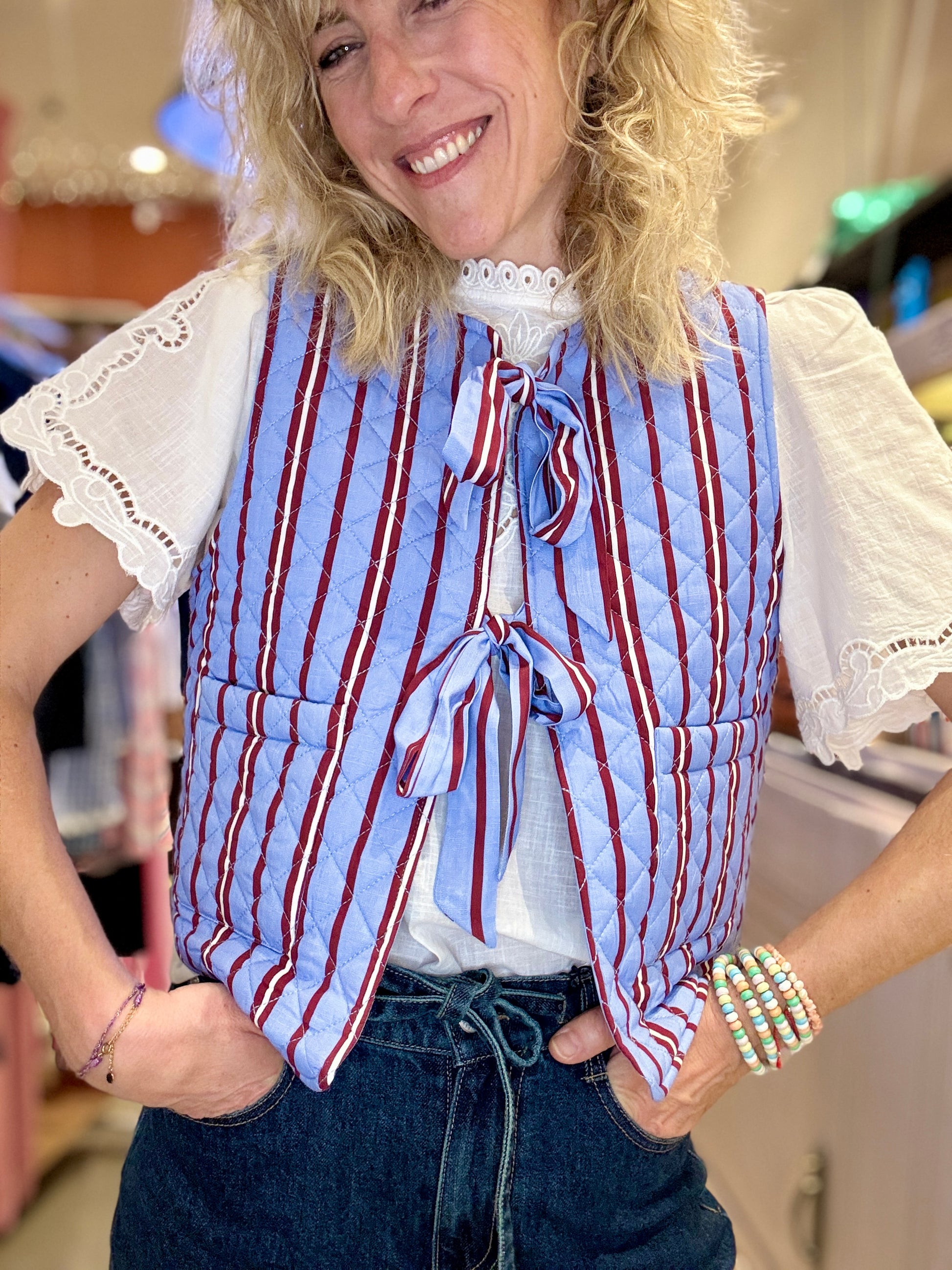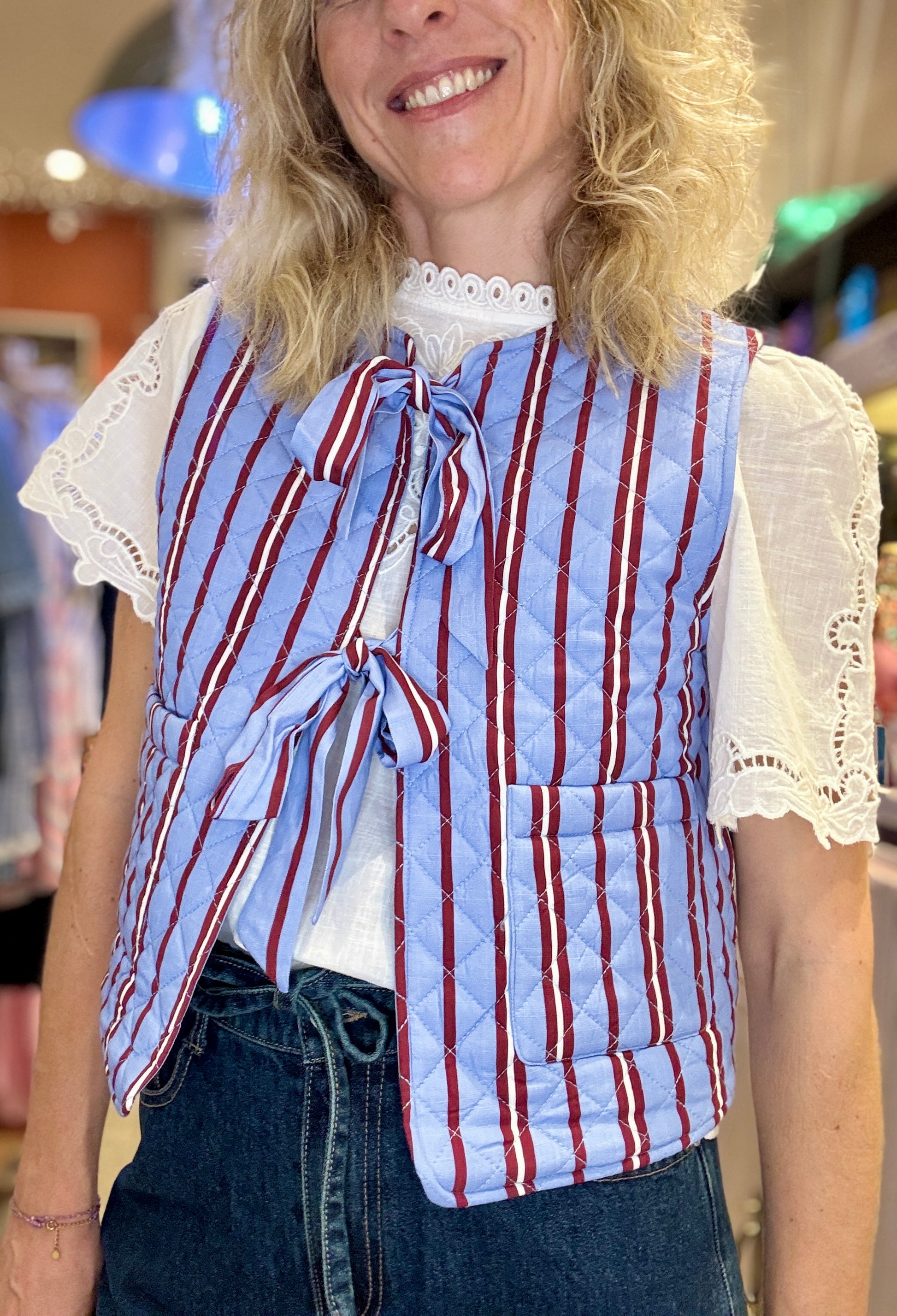 Affirmez votre style avec cette veste sans manches matelassée au design unique. Son motif à rayures verticales bordeaux sur fond bleu ciel apporte une touche rétro assumée, tandis que sa texture matelassée en losanges assure un confort optimal et une silhouette structurée. Parfaite à superposer sur une chemise, un t-shirt ou même un pull fin, cette pièce se porte aussi bien ouverte que ceinturée pour un effet plus ajusté.