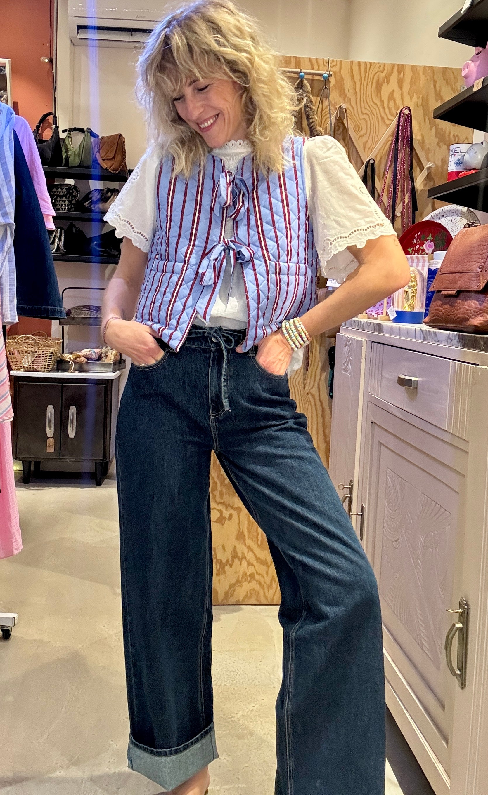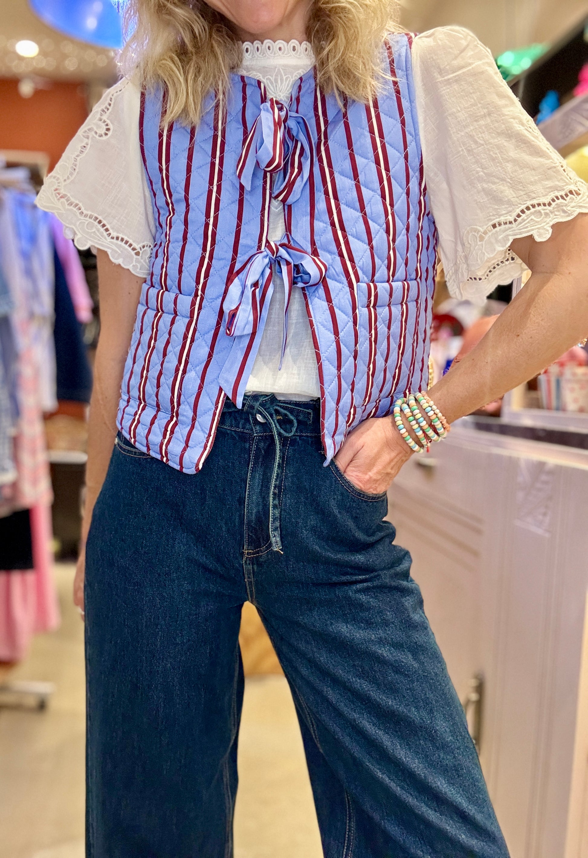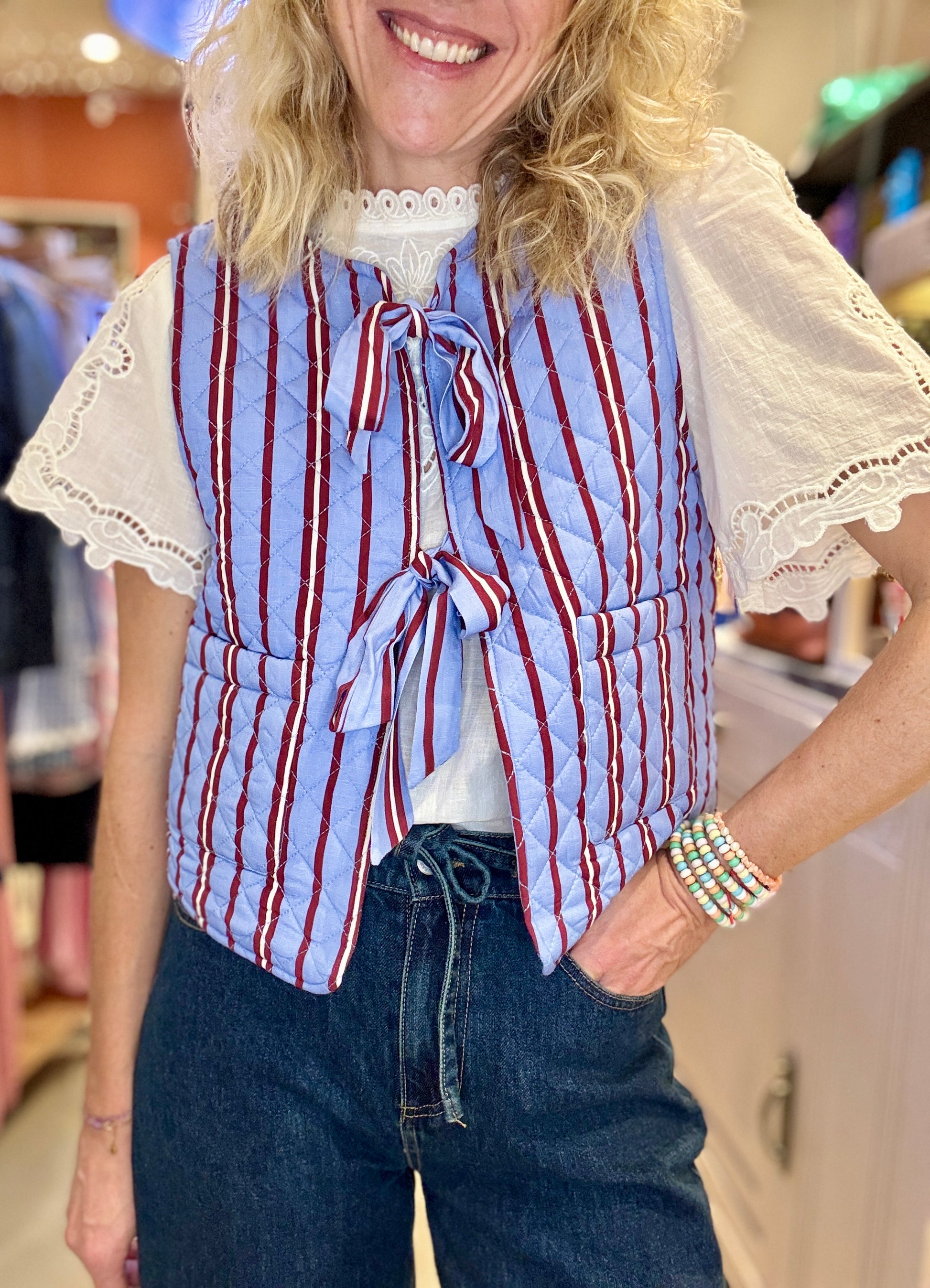 Affirmez votre style avec cette veste sans manches matelassée au design unique. Son motif à rayures verticales bordeaux sur fond bleu ciel apporte une touche rétro assumée, tandis que sa texture matelassée en losanges assure un confort optimal et une silhouette structurée. Parfaite à superposer sur une chemise, un t-shirt ou même un pull fin, cette pièce se porte aussi bien ouverte que ceinturée pour un effet plus ajusté.