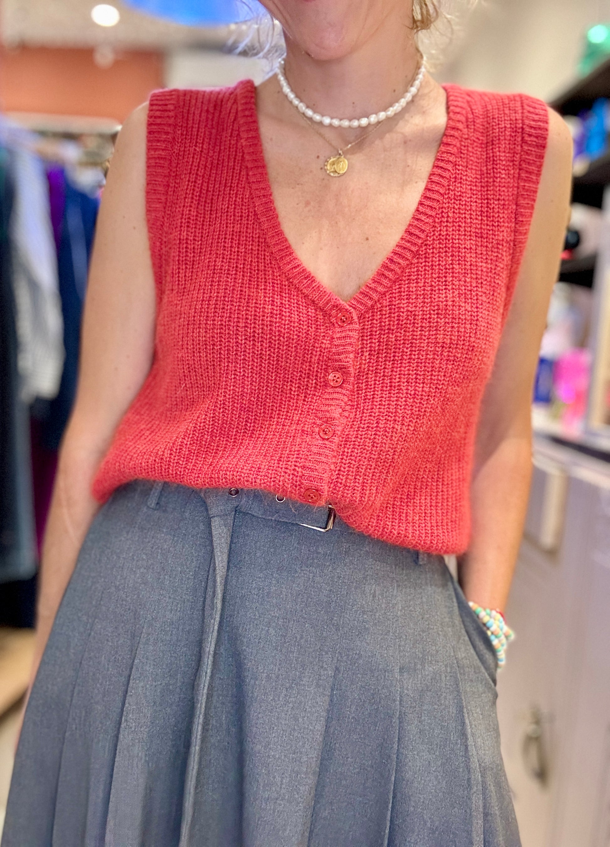 Maille ultra douce, coupe droite, col V, fermé par boutons.
