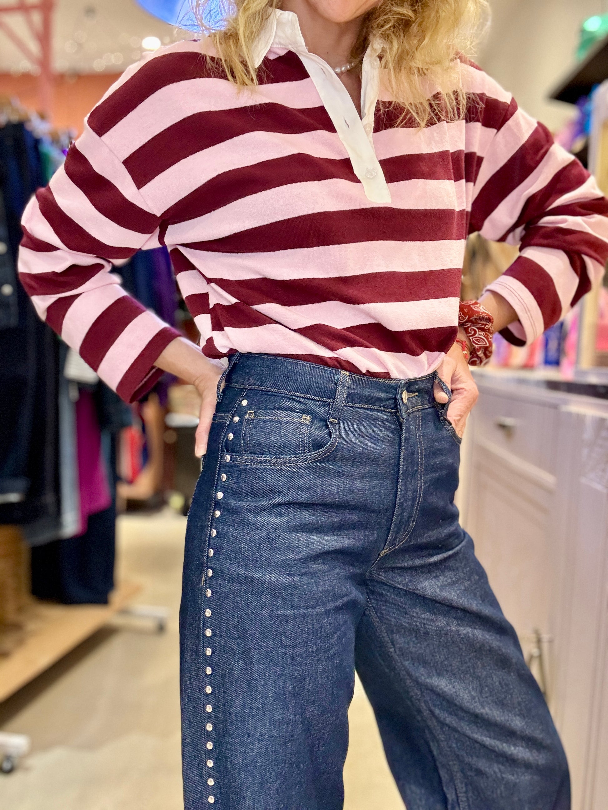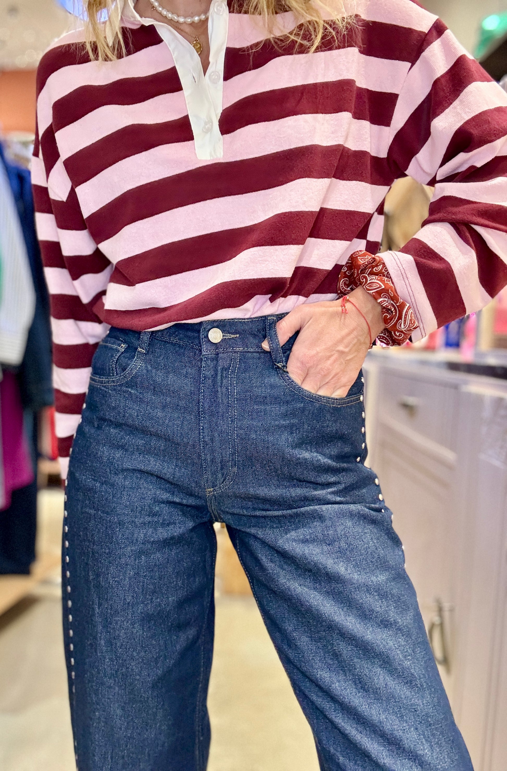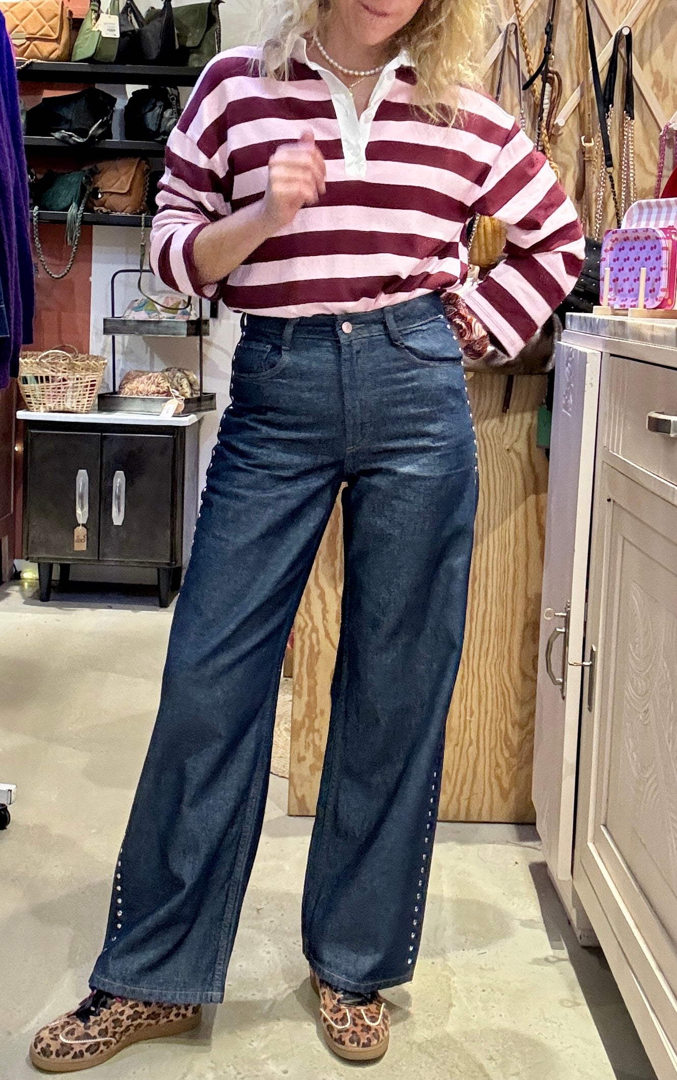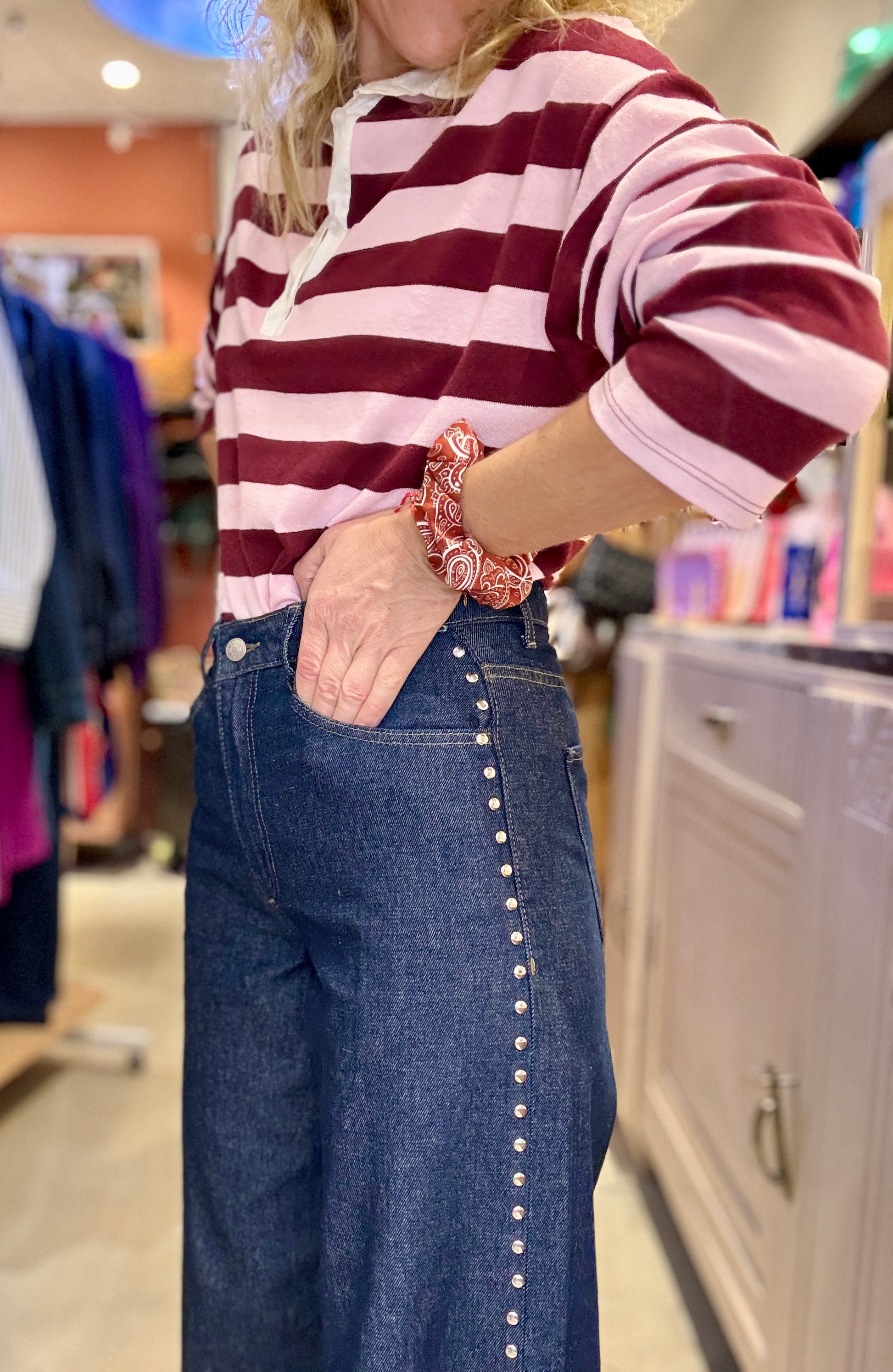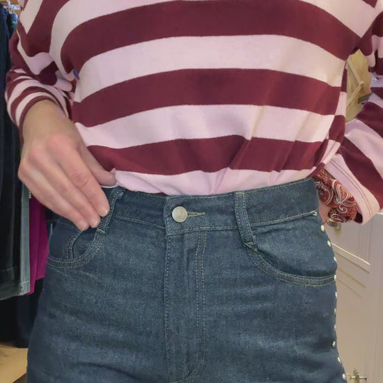 Coupe légèrement ballon, taille haute, bande sur le côté avec des clous argentés.