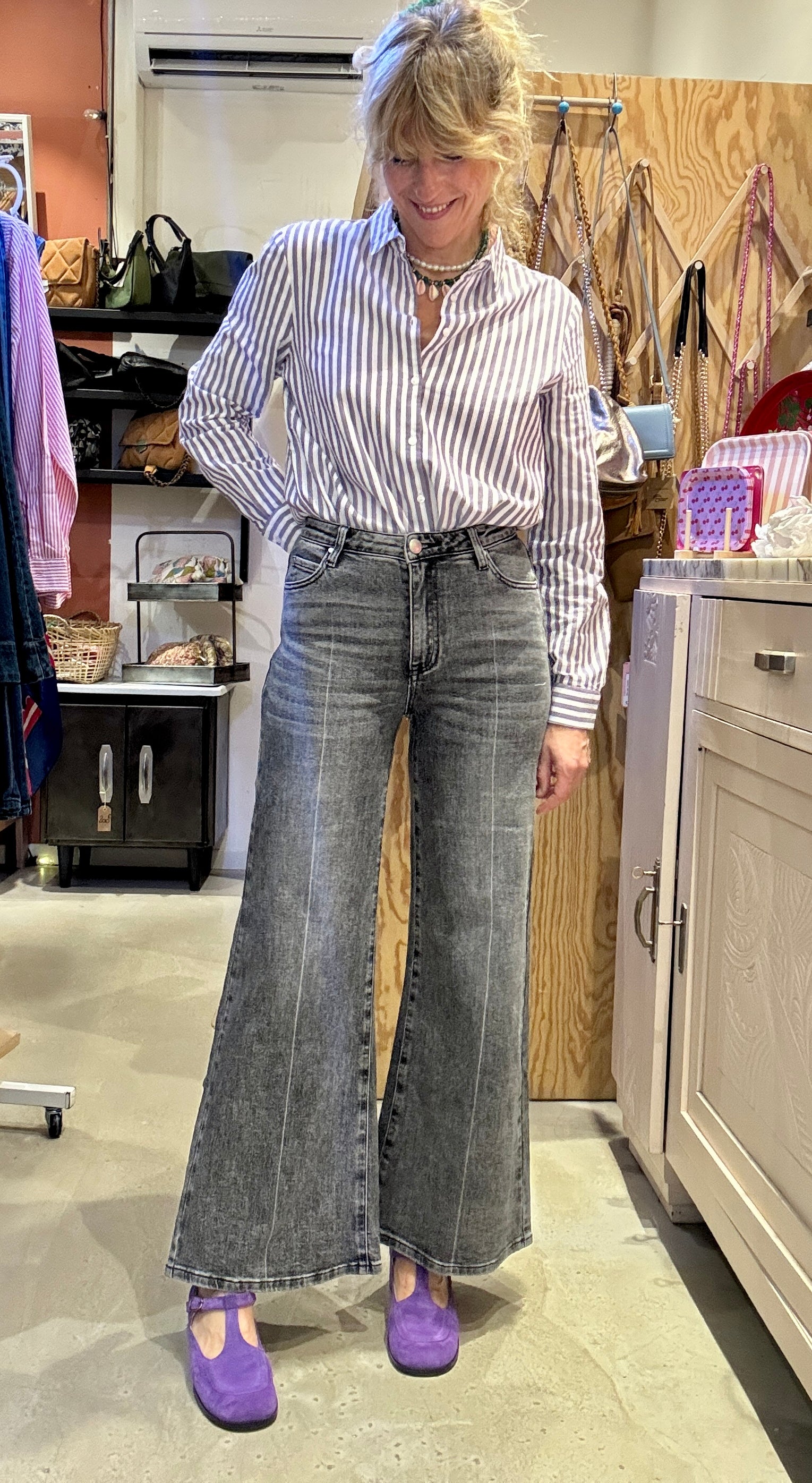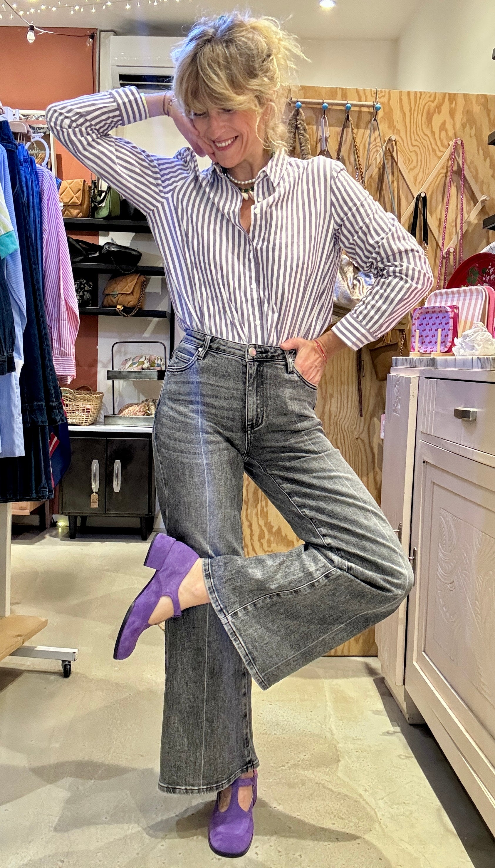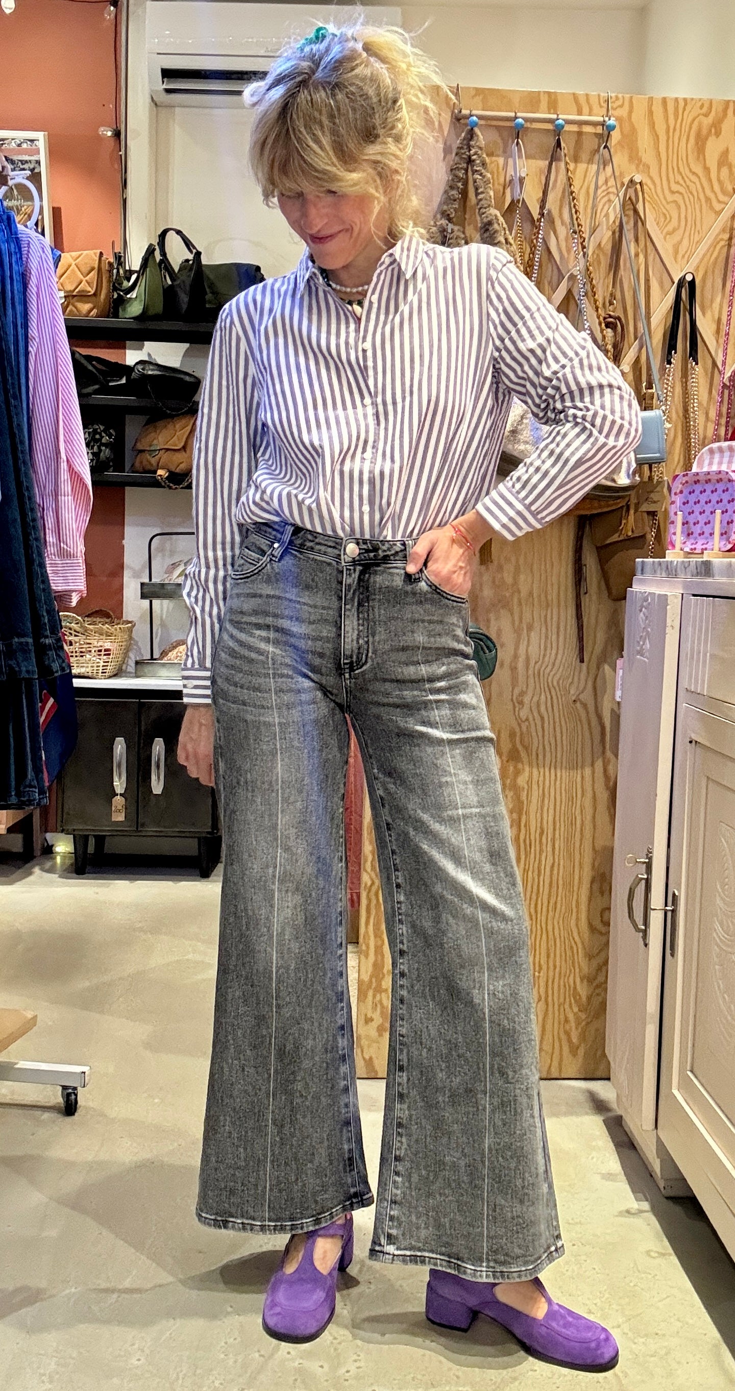 Coup wild leg, évasé dans le bas. Bien ajusté aux hanches et large sur la cuisse.