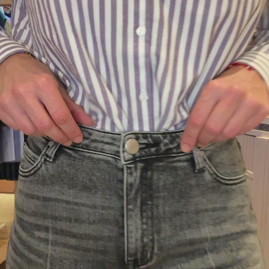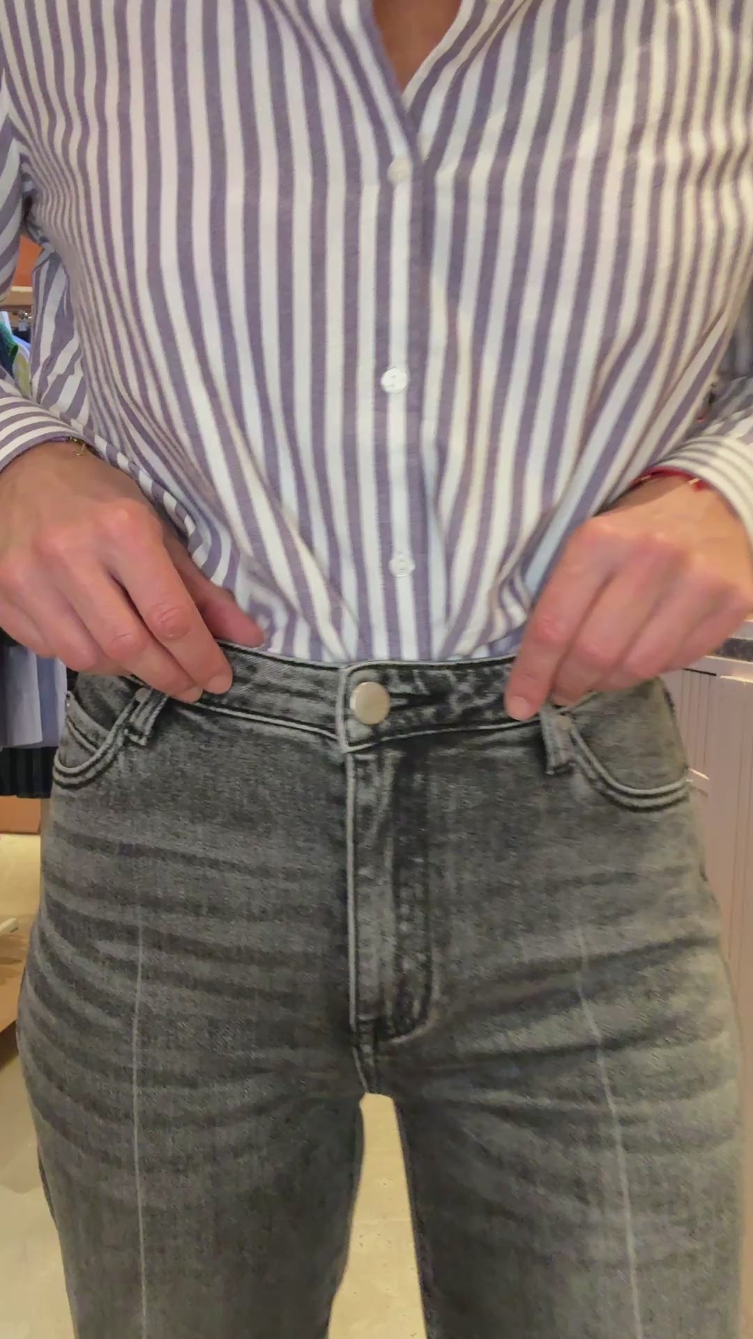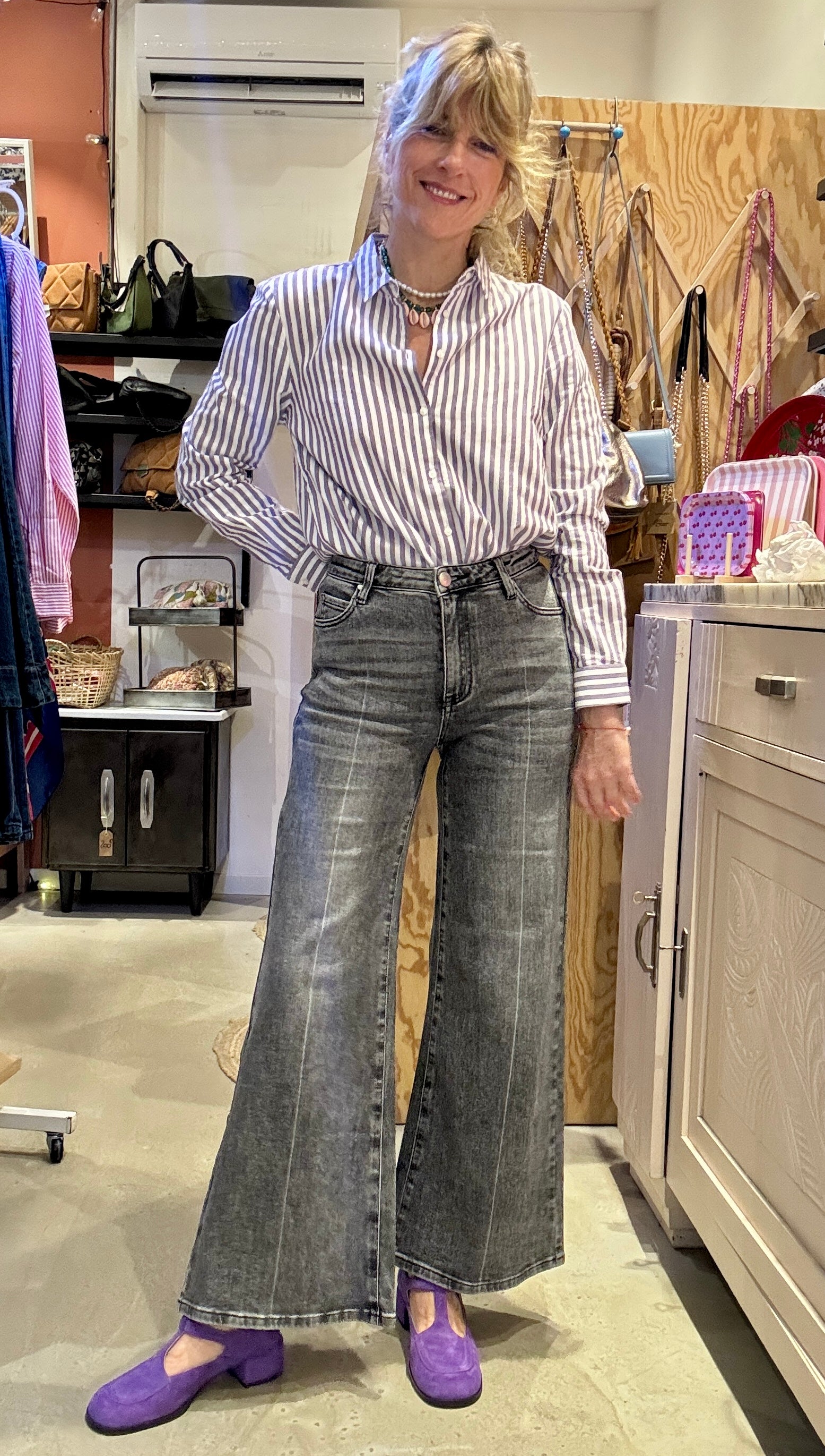 Coup wild leg, évasé dans le bas. Bien ajusté aux hanches et large sur la cuisse.