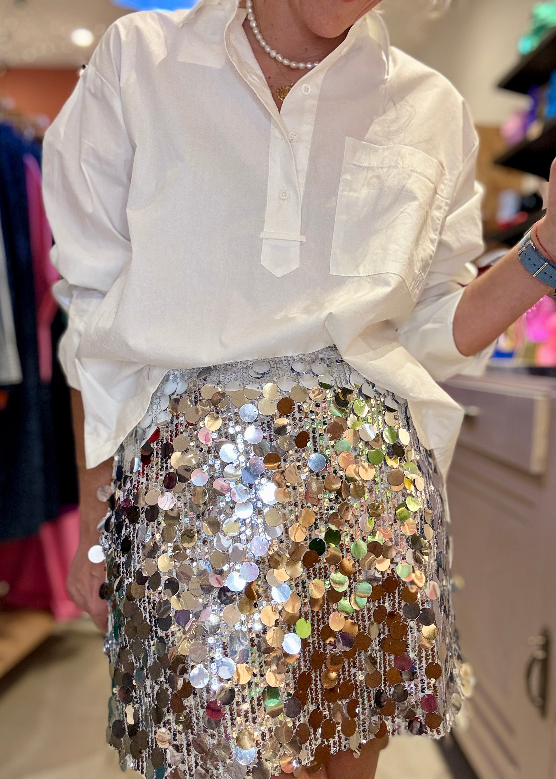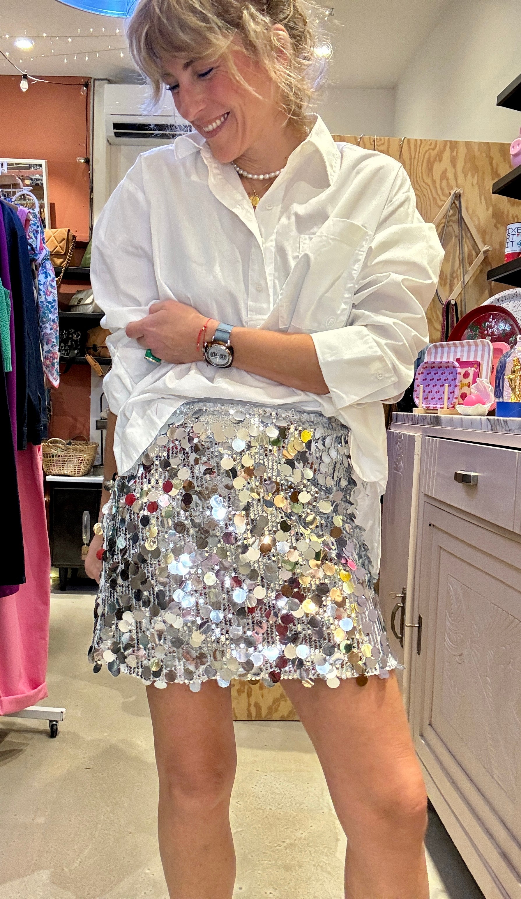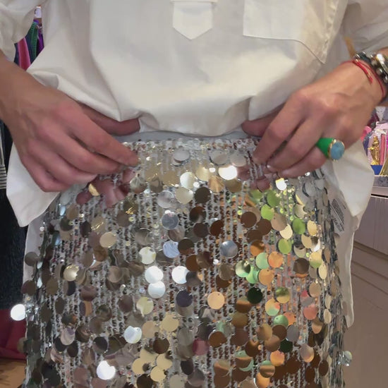 Jolie jupe à gros sequins argentés.