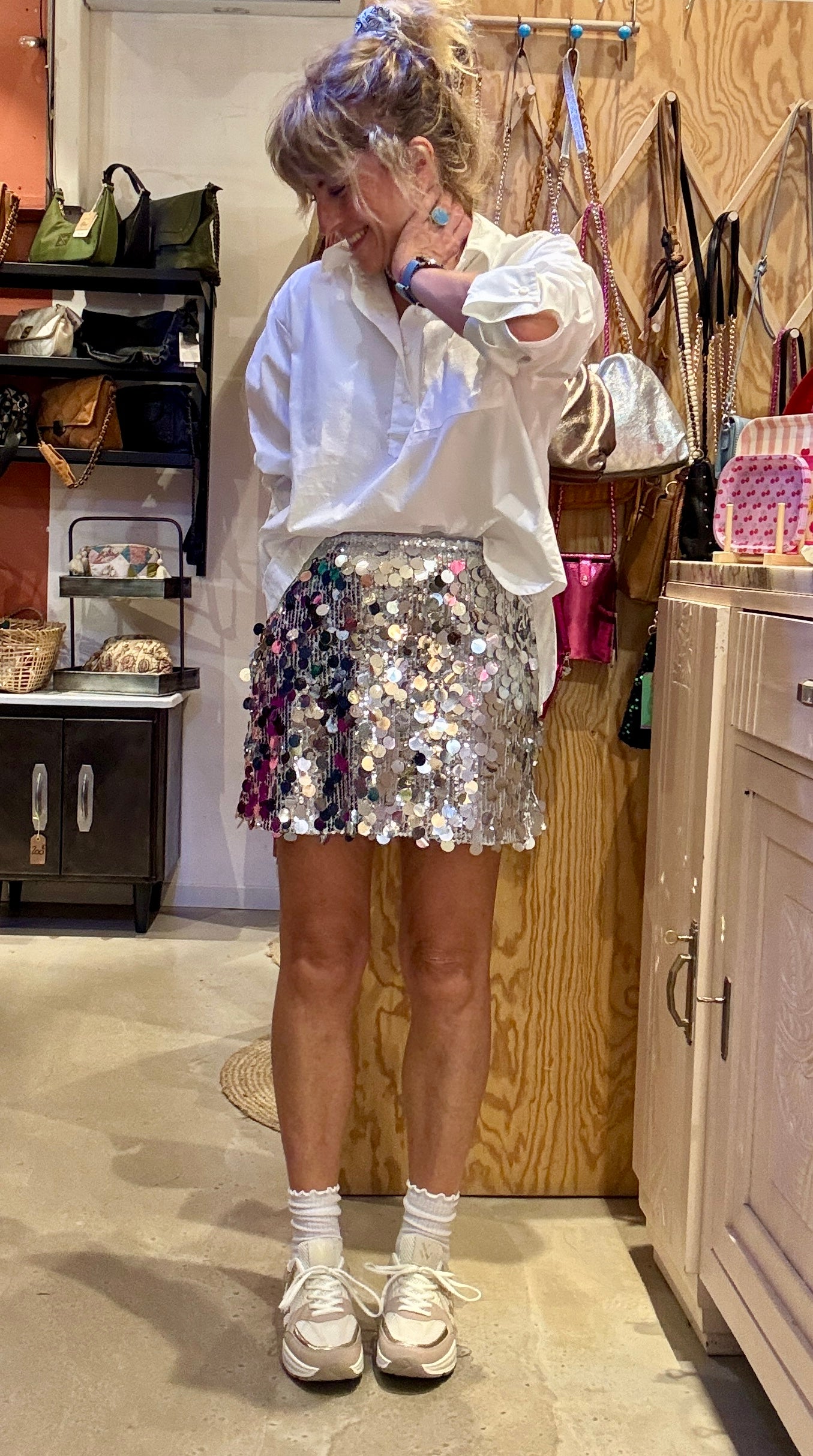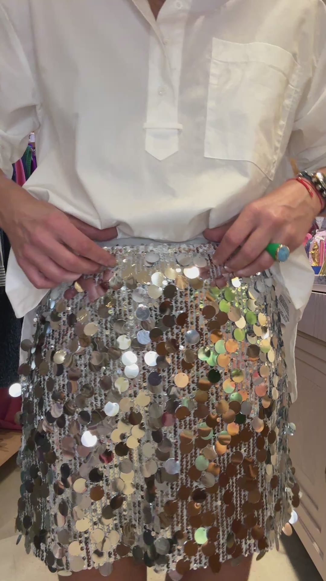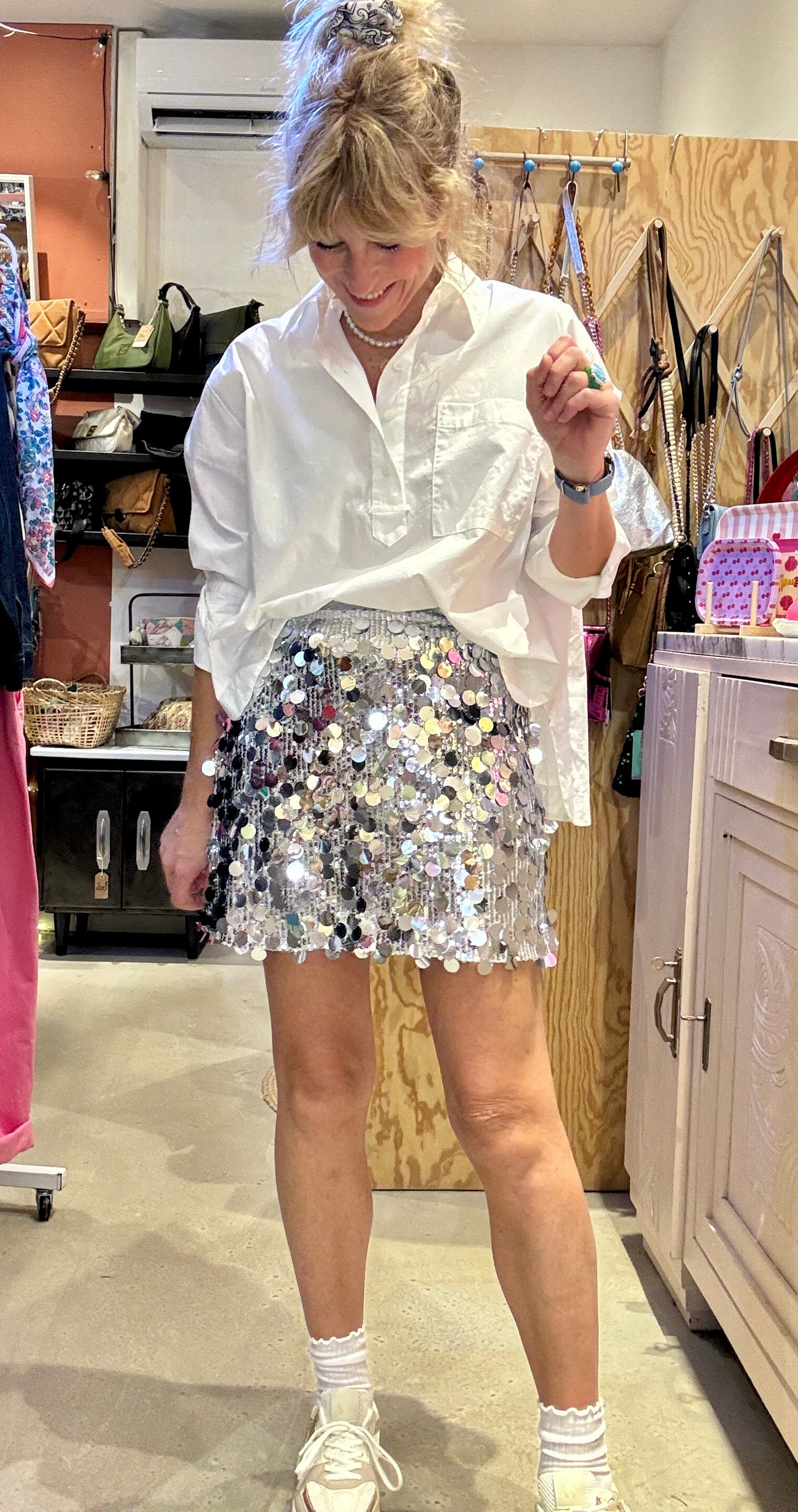 Jolie jupe à gros sequins argentés.