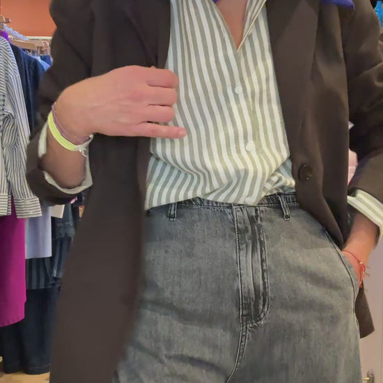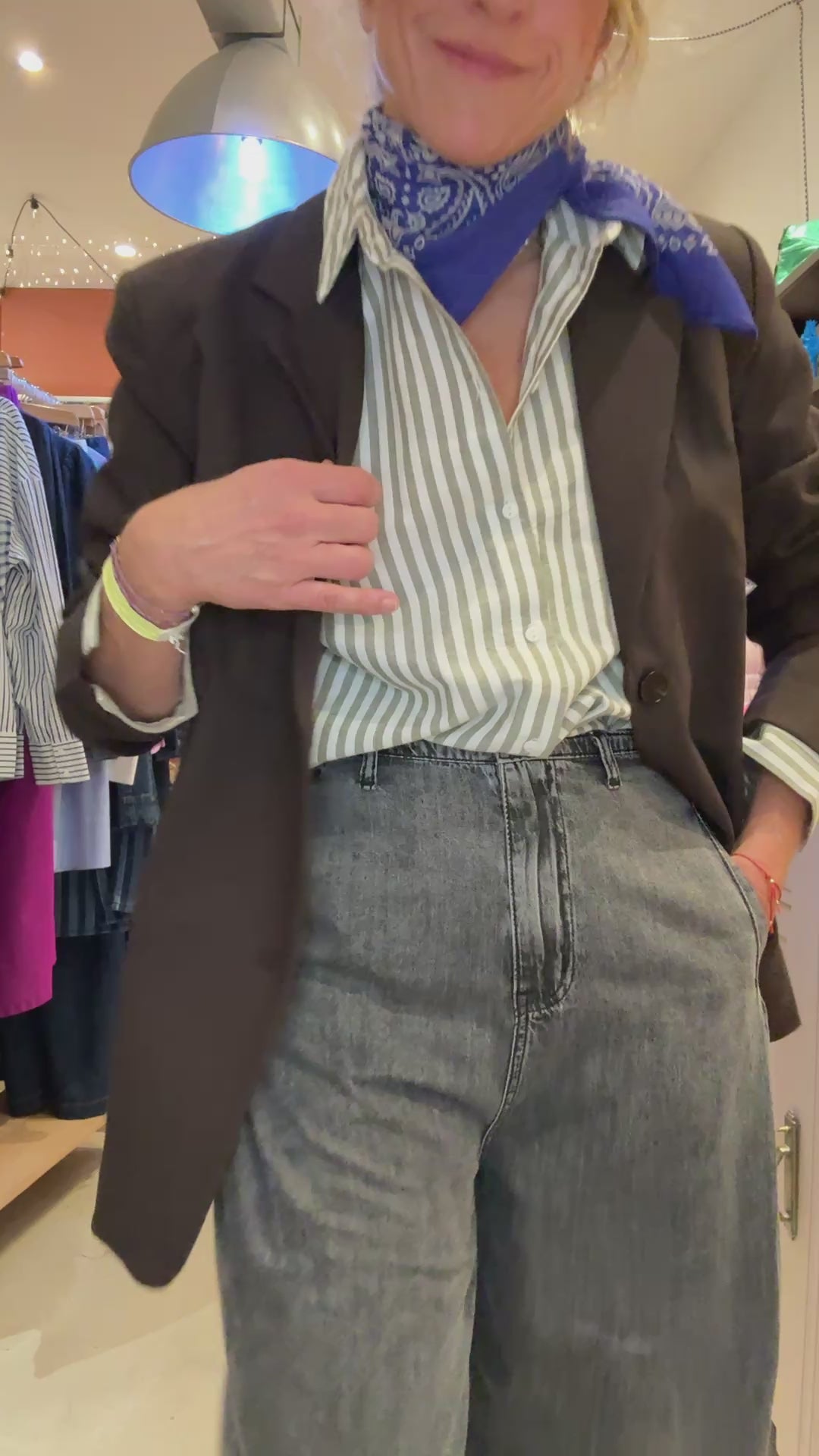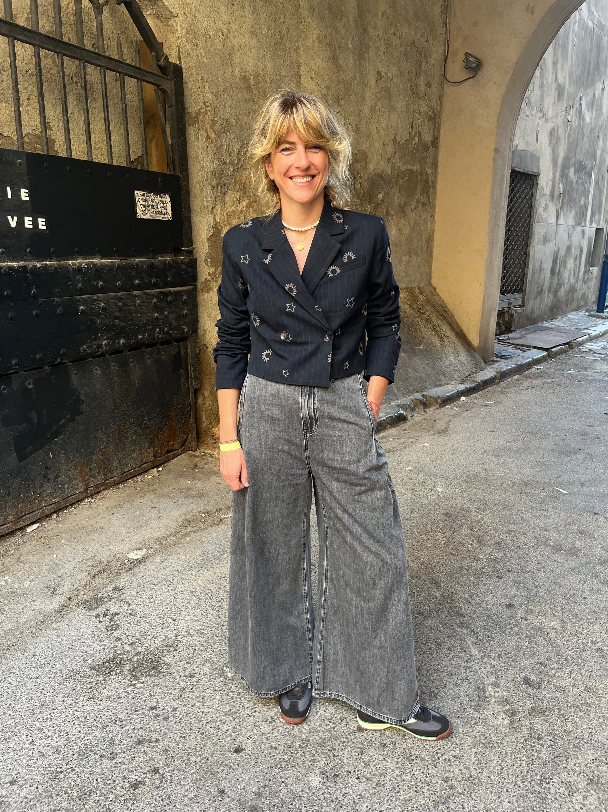 Taille haute, taille droite, pinces sur les côtés au niveau des hanches et jambes bien larges.