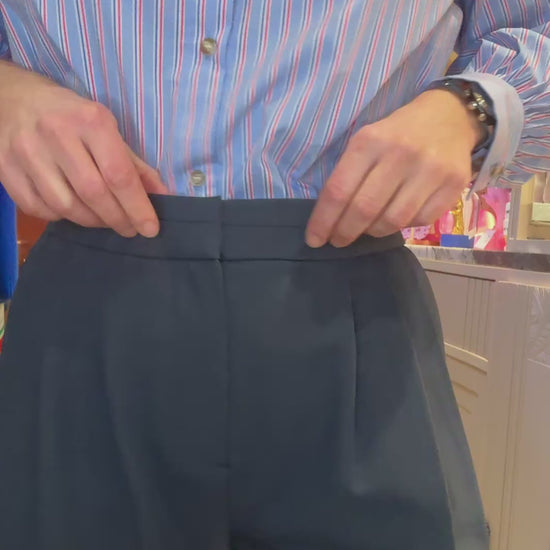 Coupe large avec pinces sur le devant, taille plate devant et élastiquée dans le dos pour plus de confort.