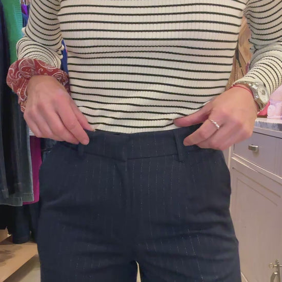 Magnifique pantalon à pinces bleu marine avec fines rayures argenté.