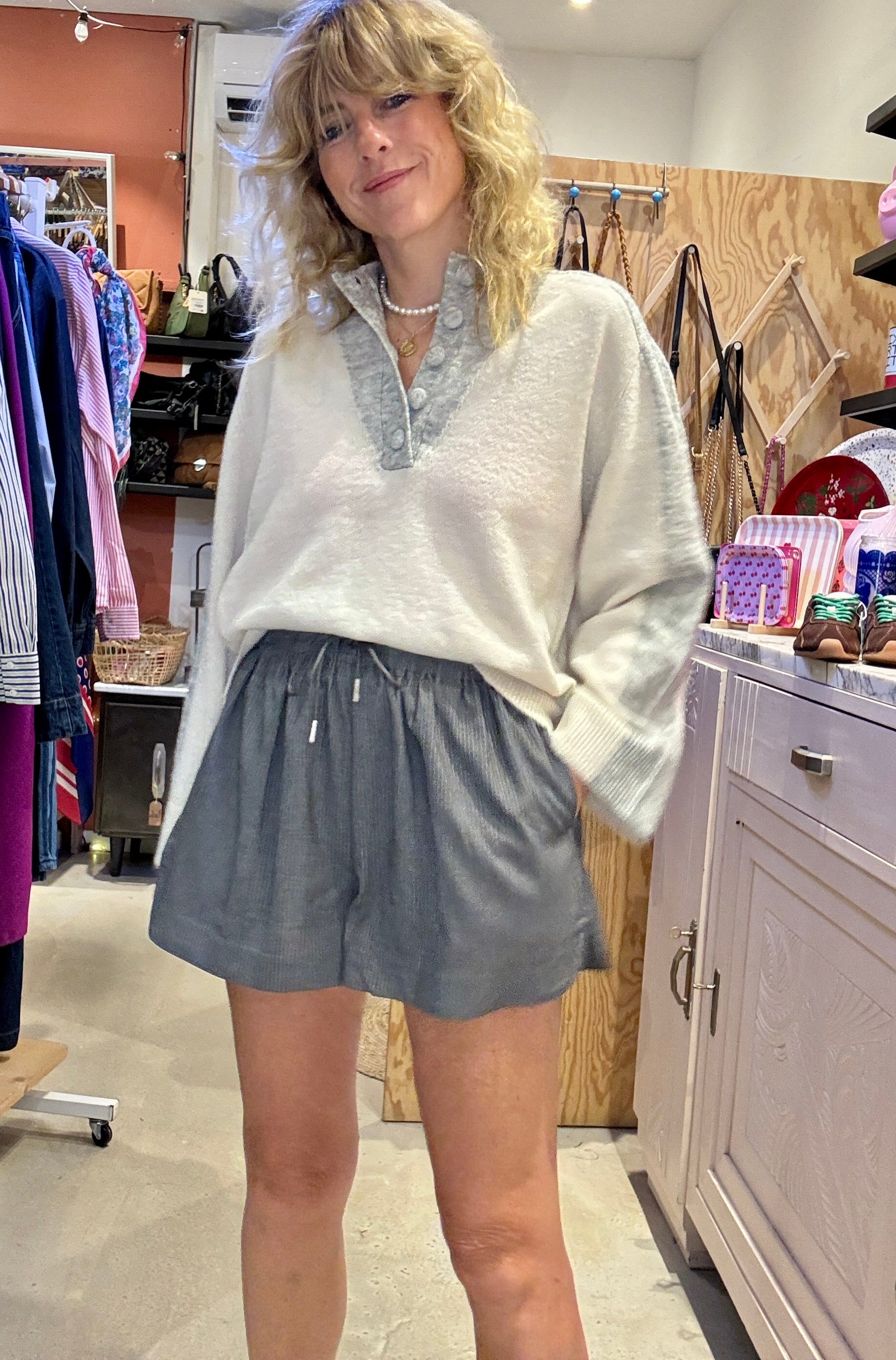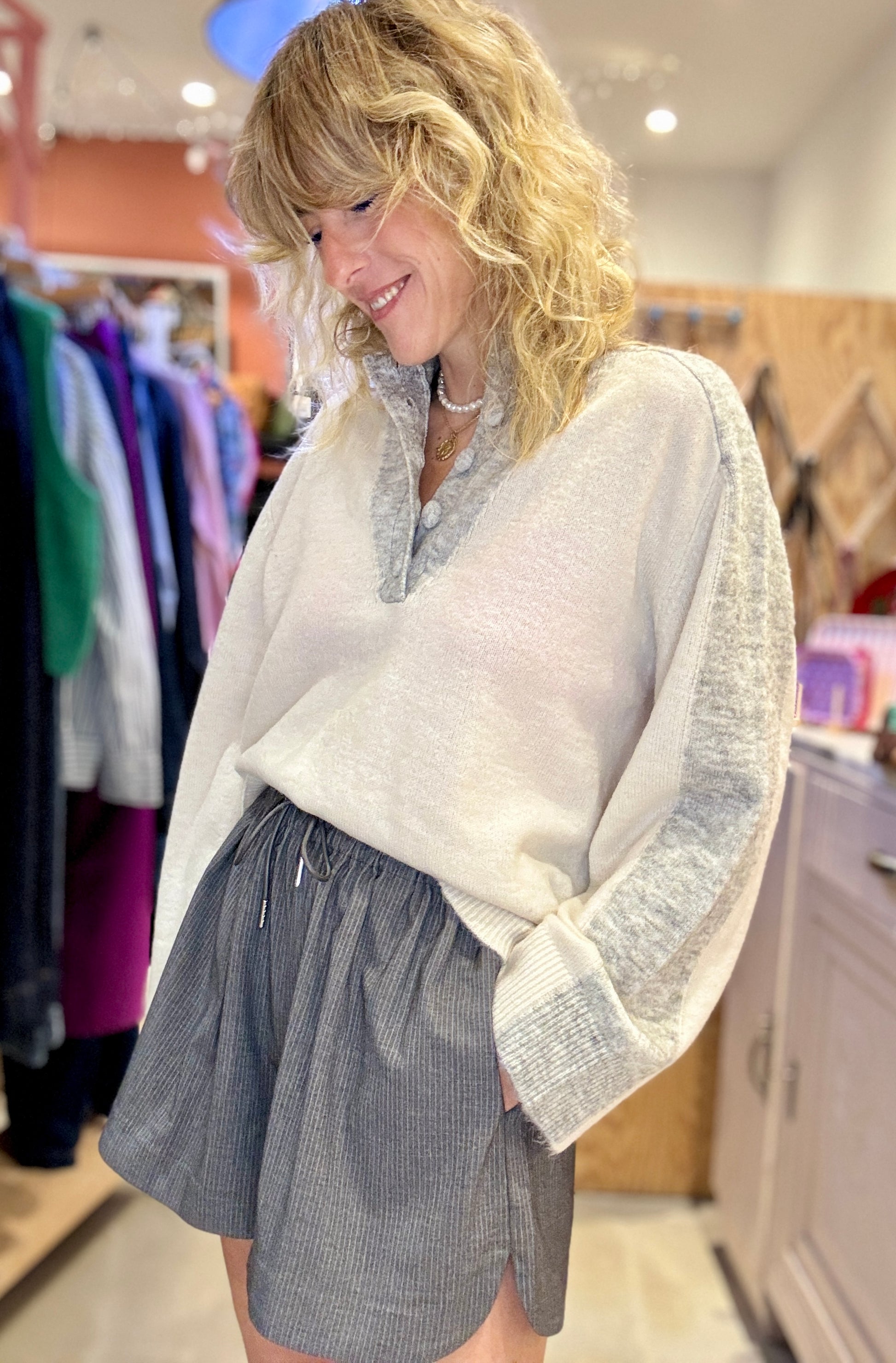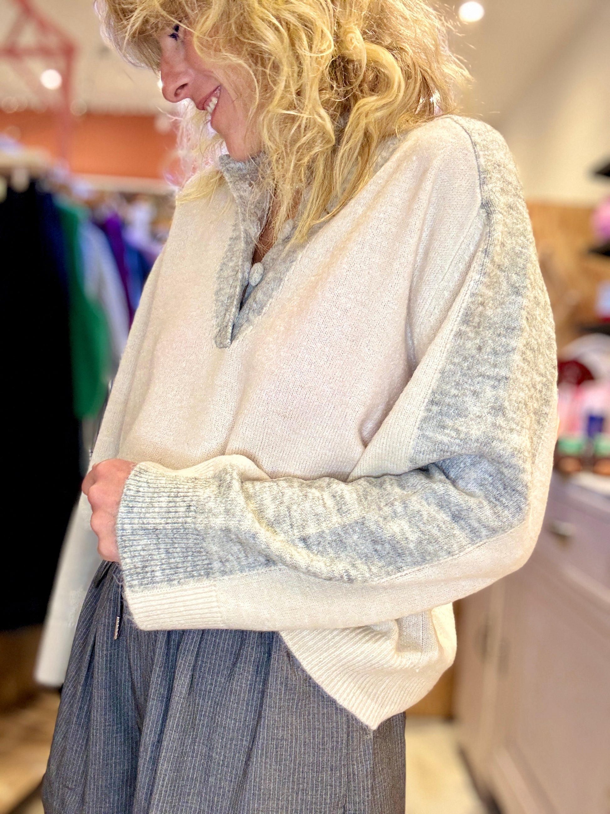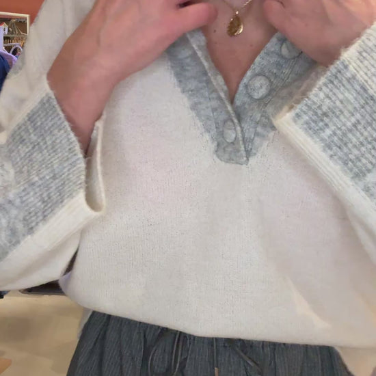 Pull bi-couleurs écru et gris chiné avec col cheminé boutonné.