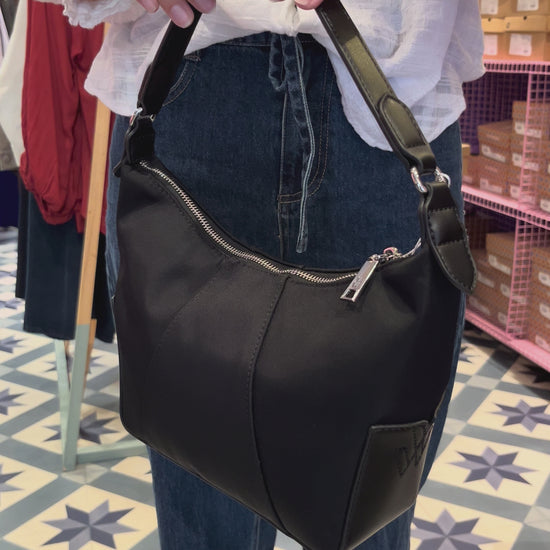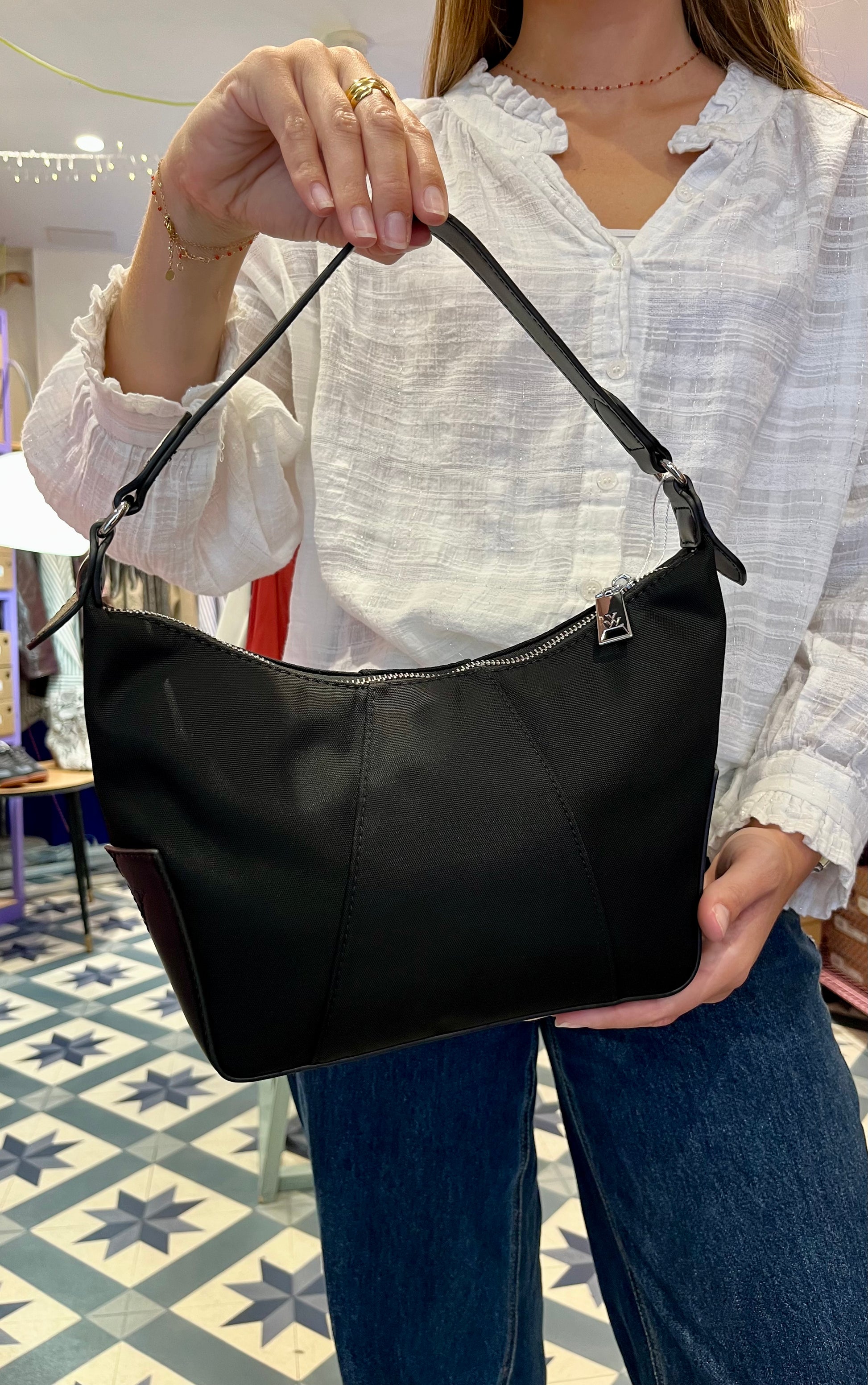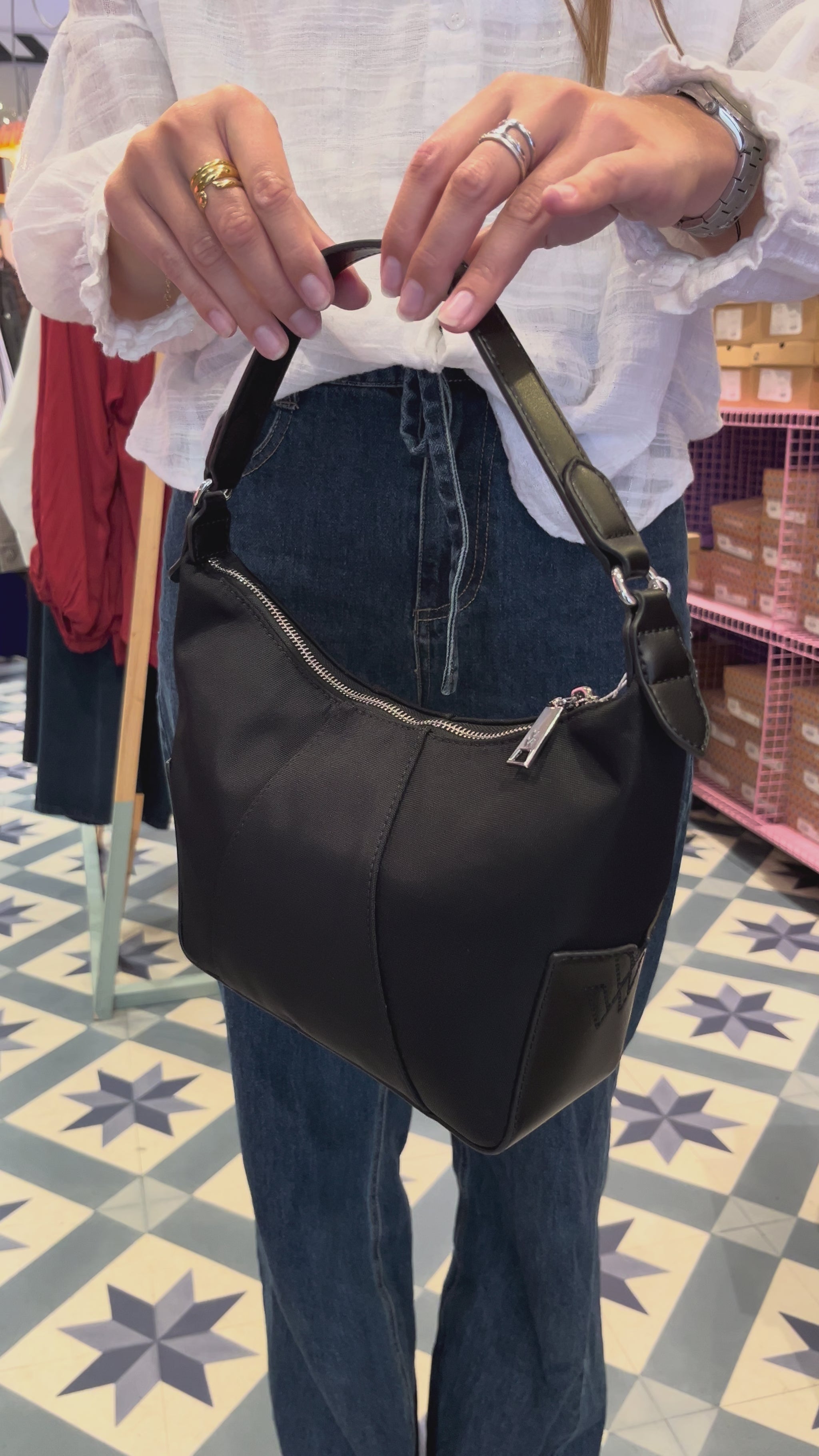 - Bandoulière en tissu noir avec logo embossé, boucles et mousquetons argentées