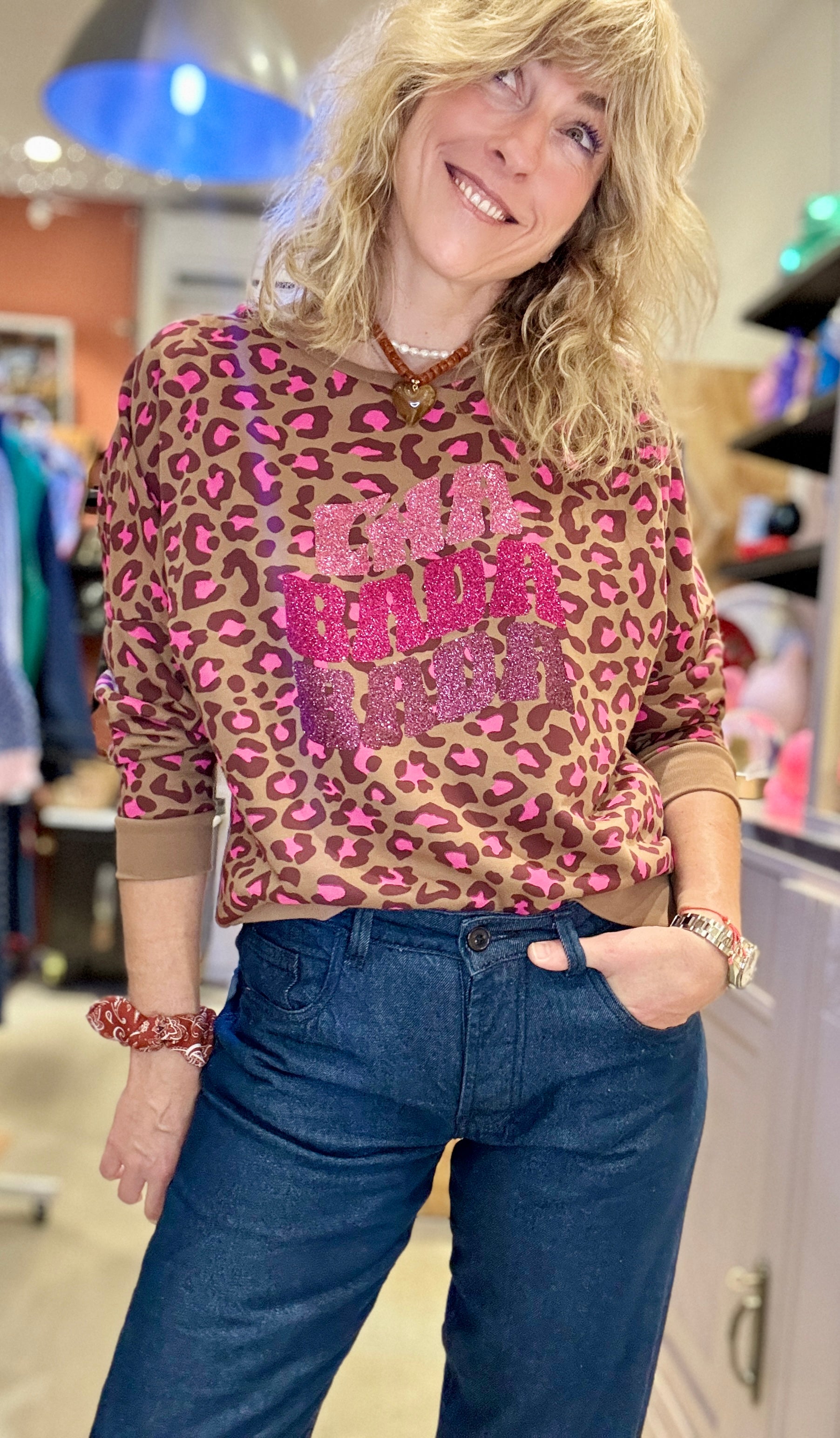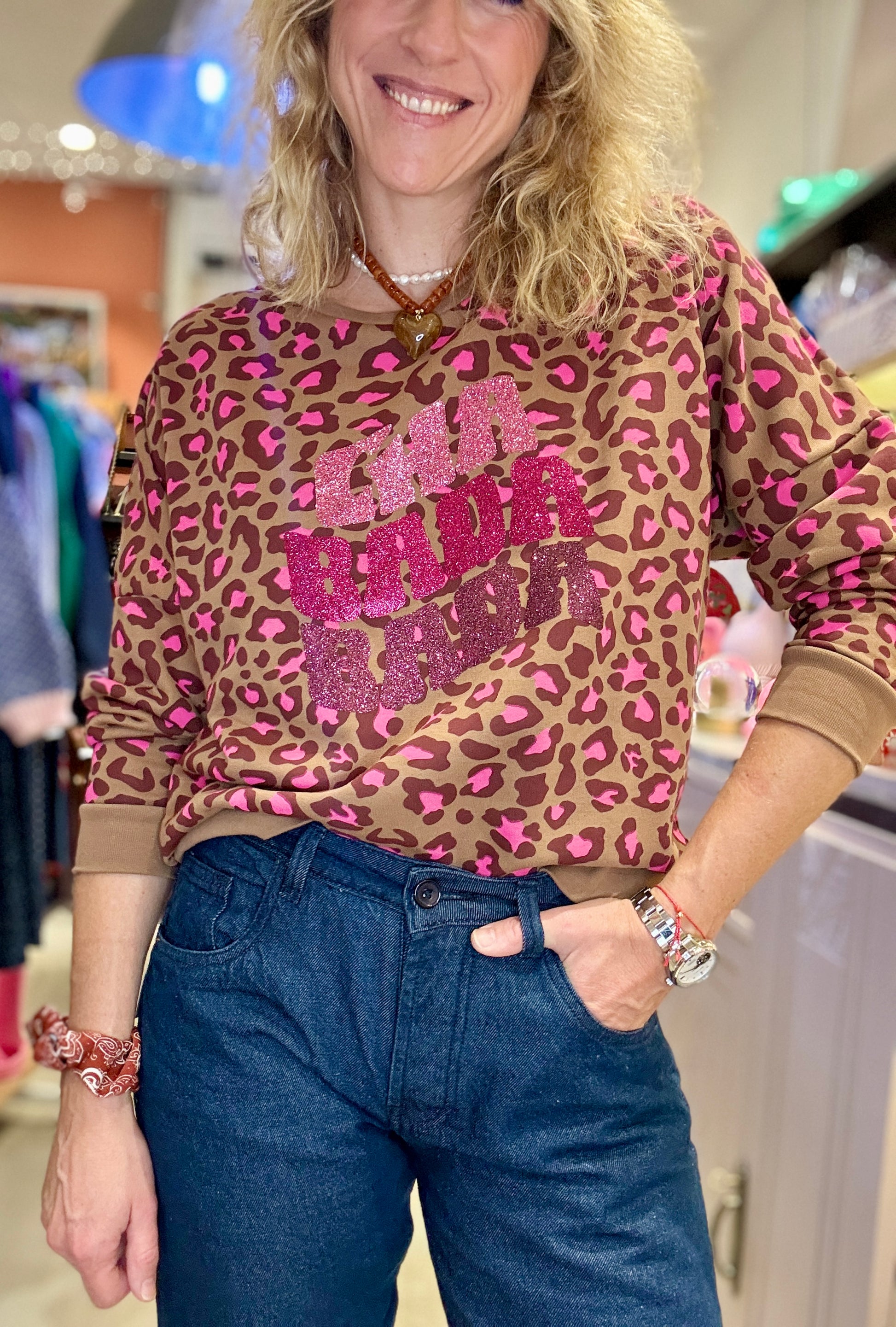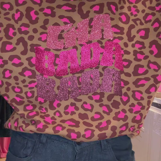 Imprimé léopard rose avec impression en paillettes.