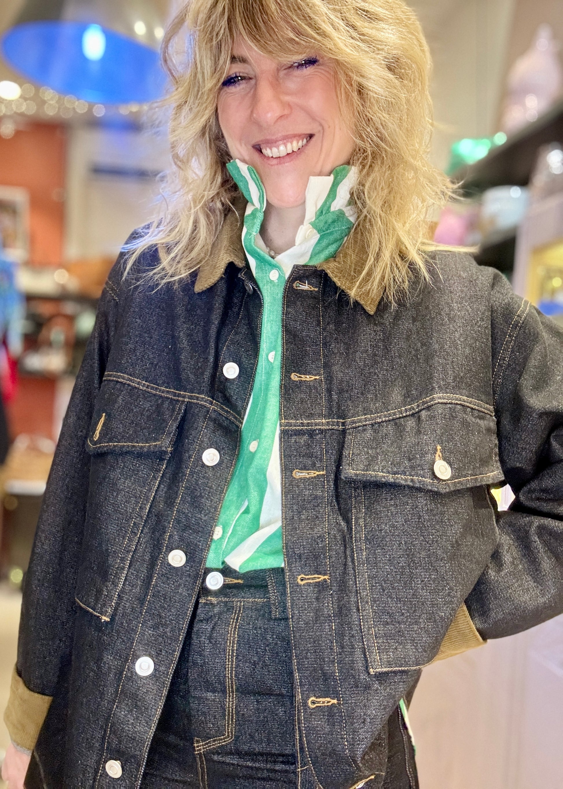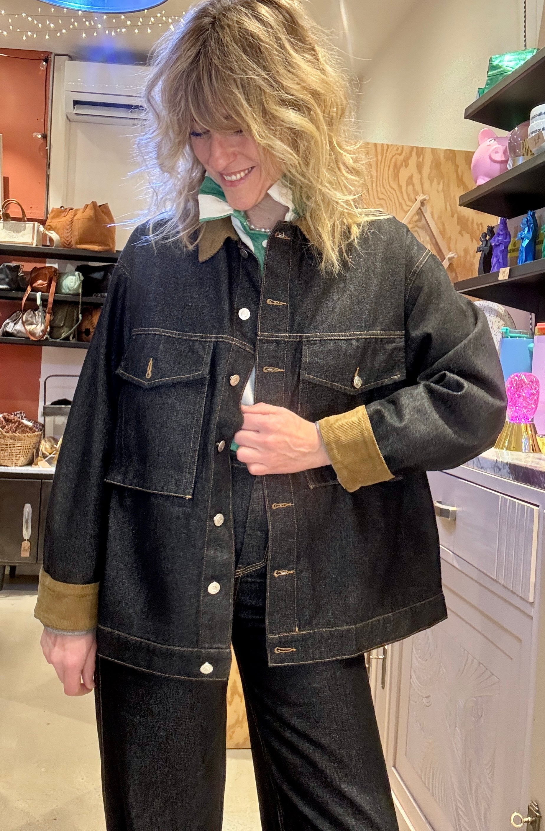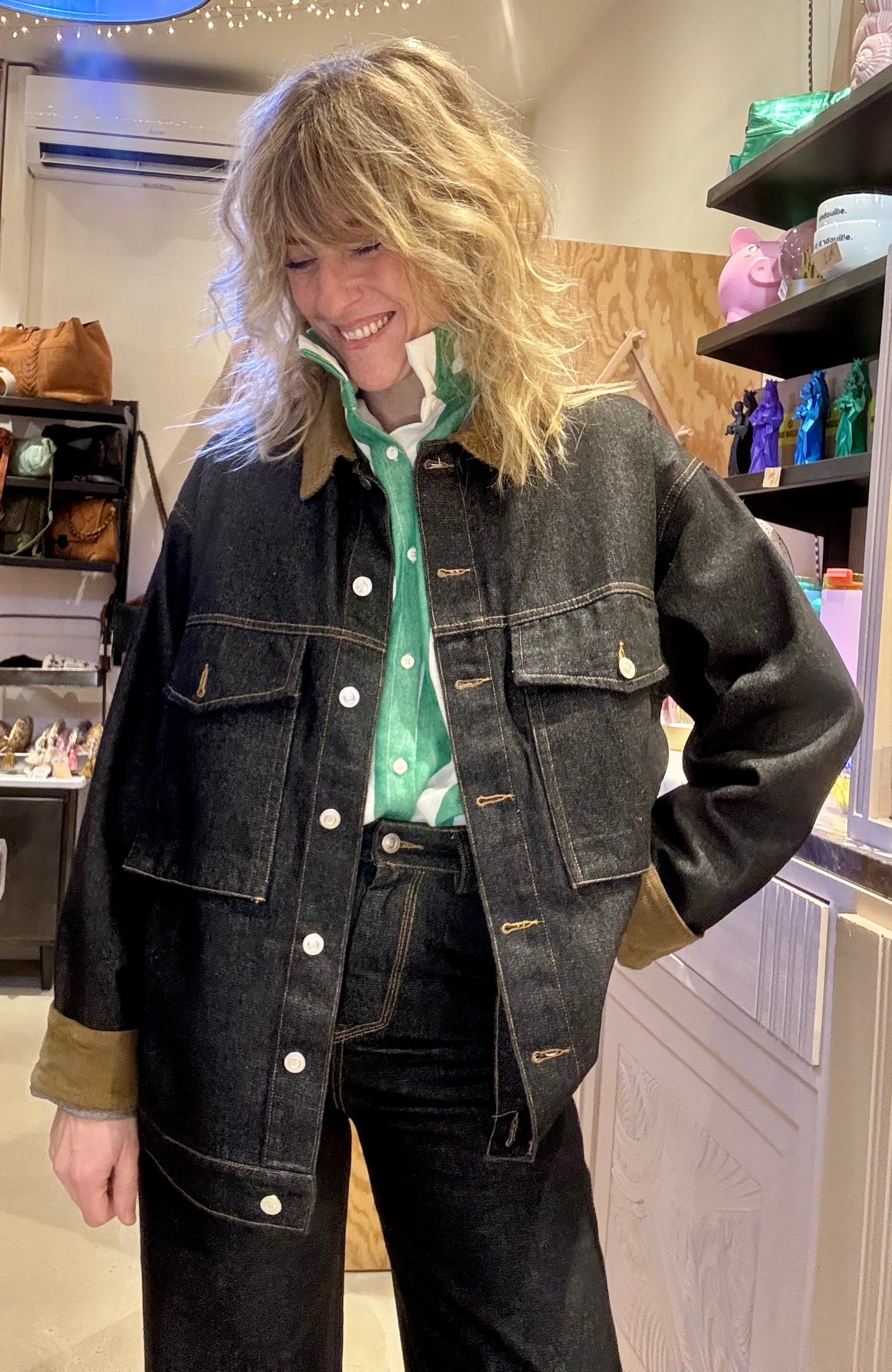 Veste barn jacket en jean brut, parfaite à porter en esemble avec le pantalon Alvin pour un total look. J'adore !!!