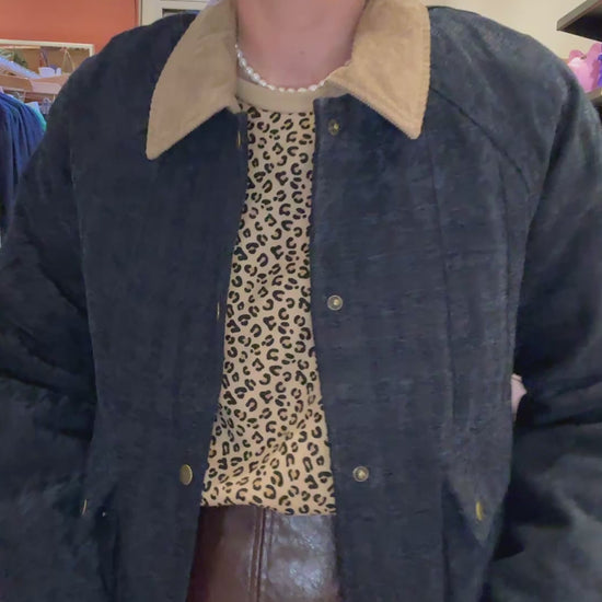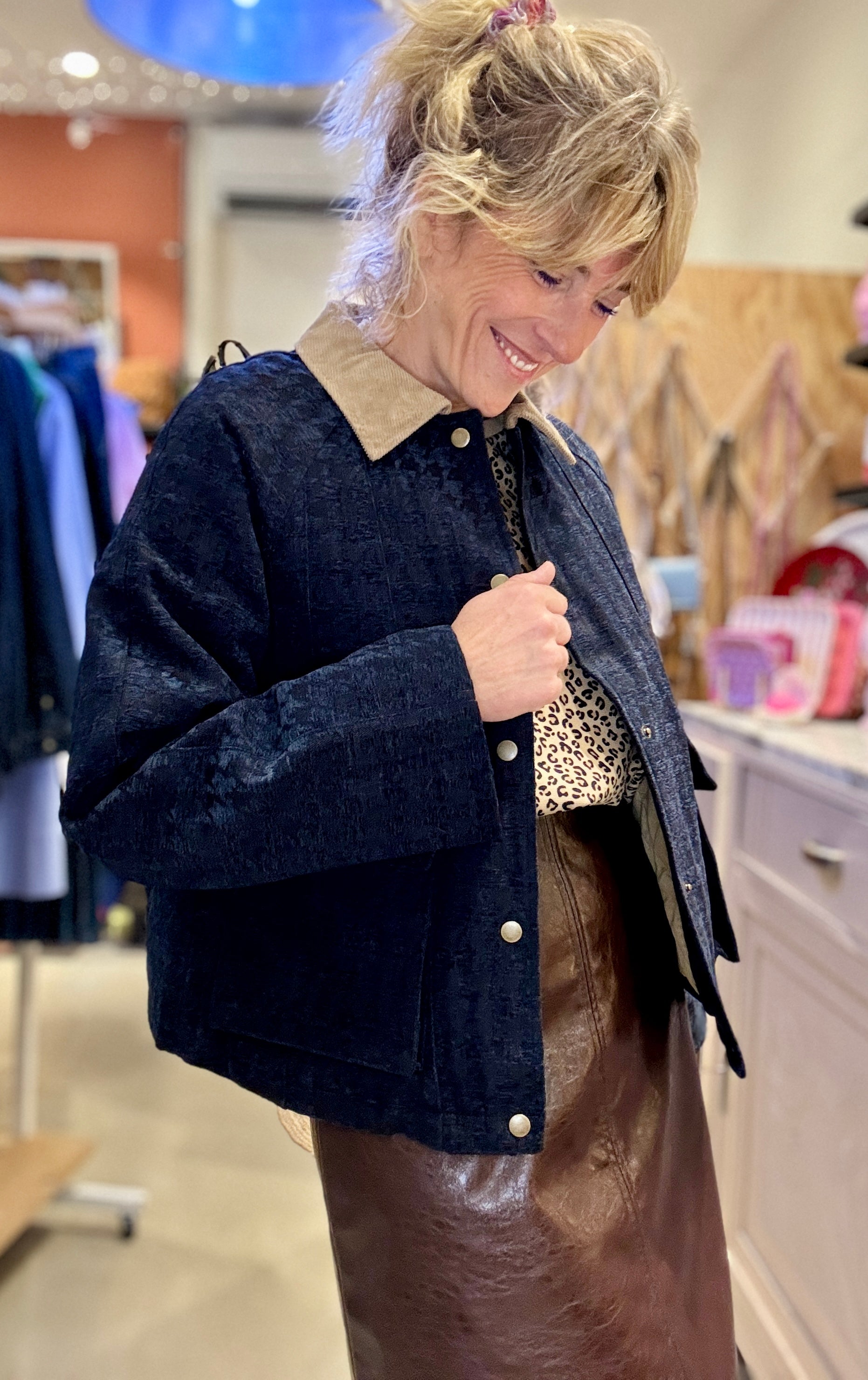Coupe droite, manches longues, col chemise en velours et deux grosses poches plates sur le devant.