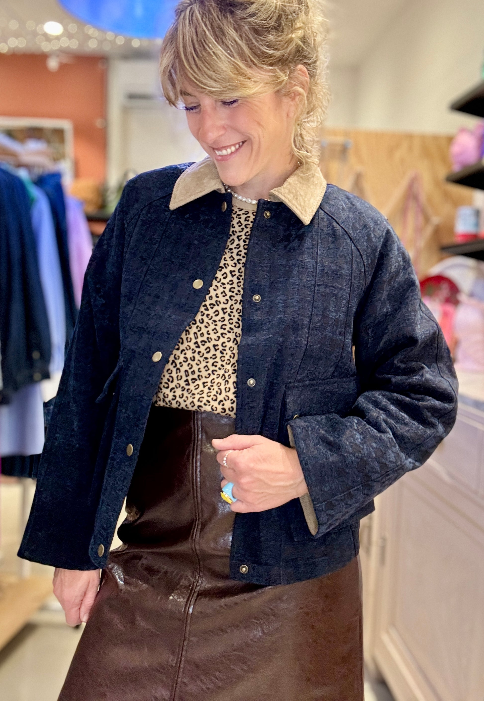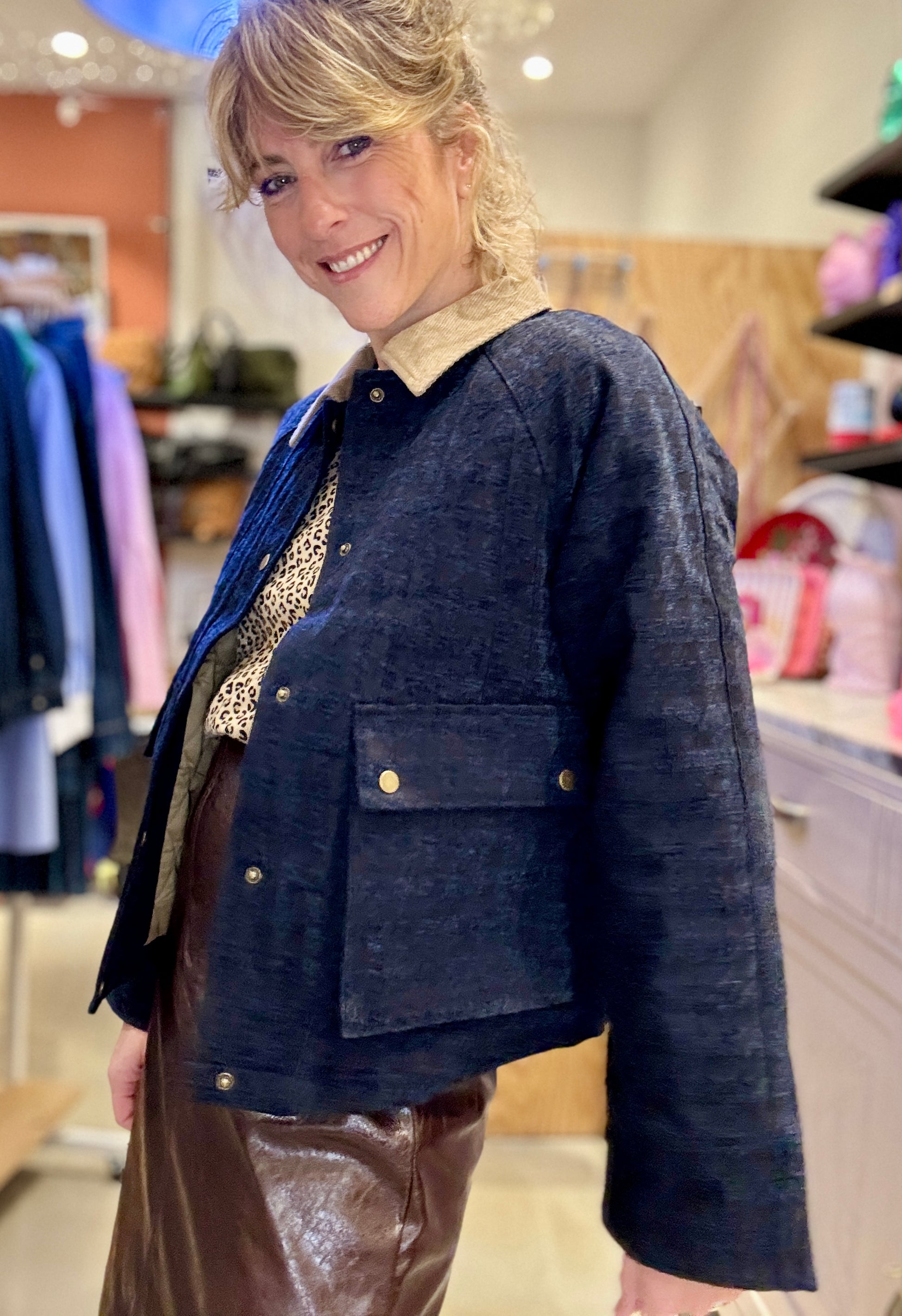 Magnifique veste matelassée en coton aspect velours impression ton sur ton pied de poule.