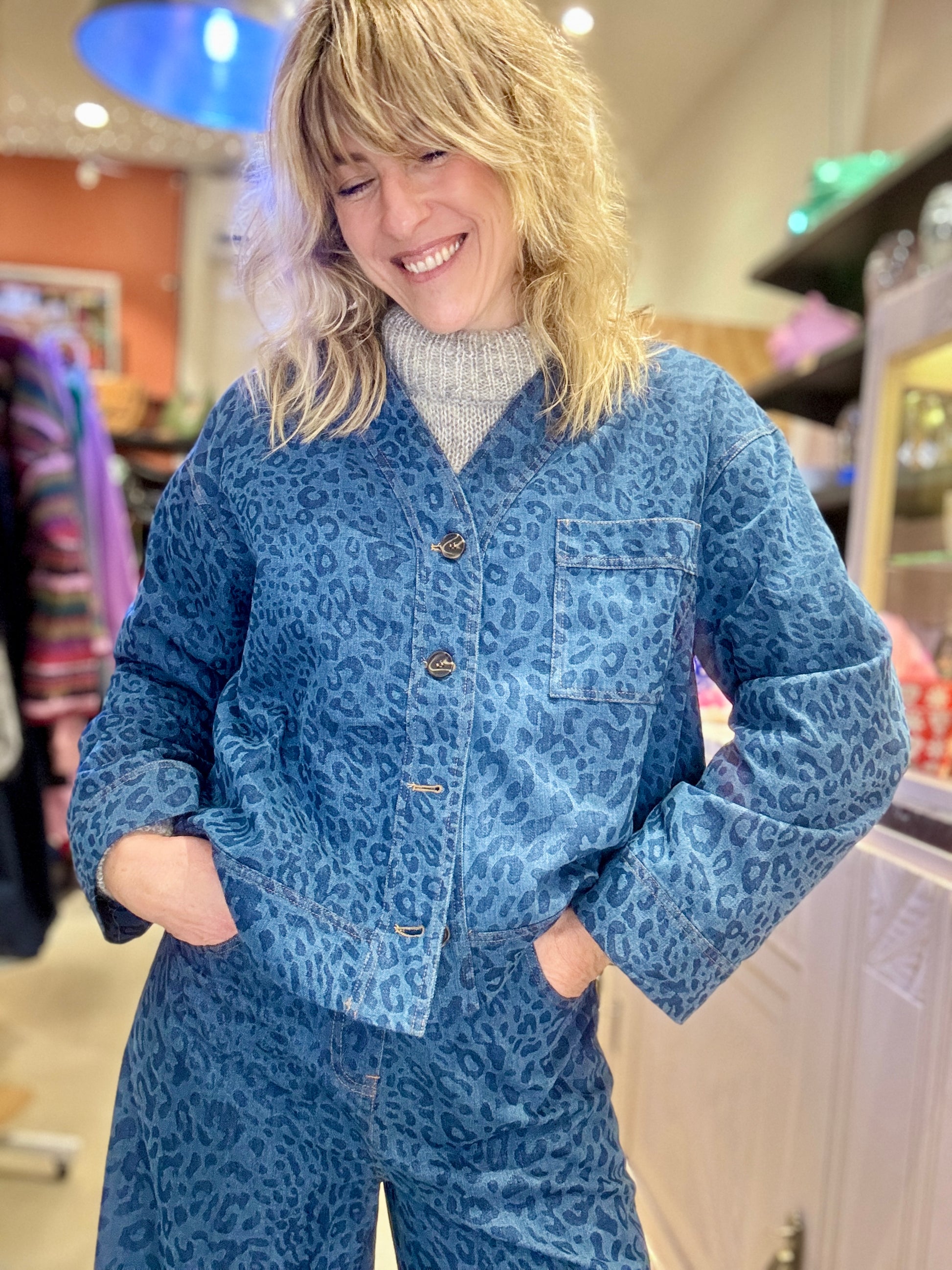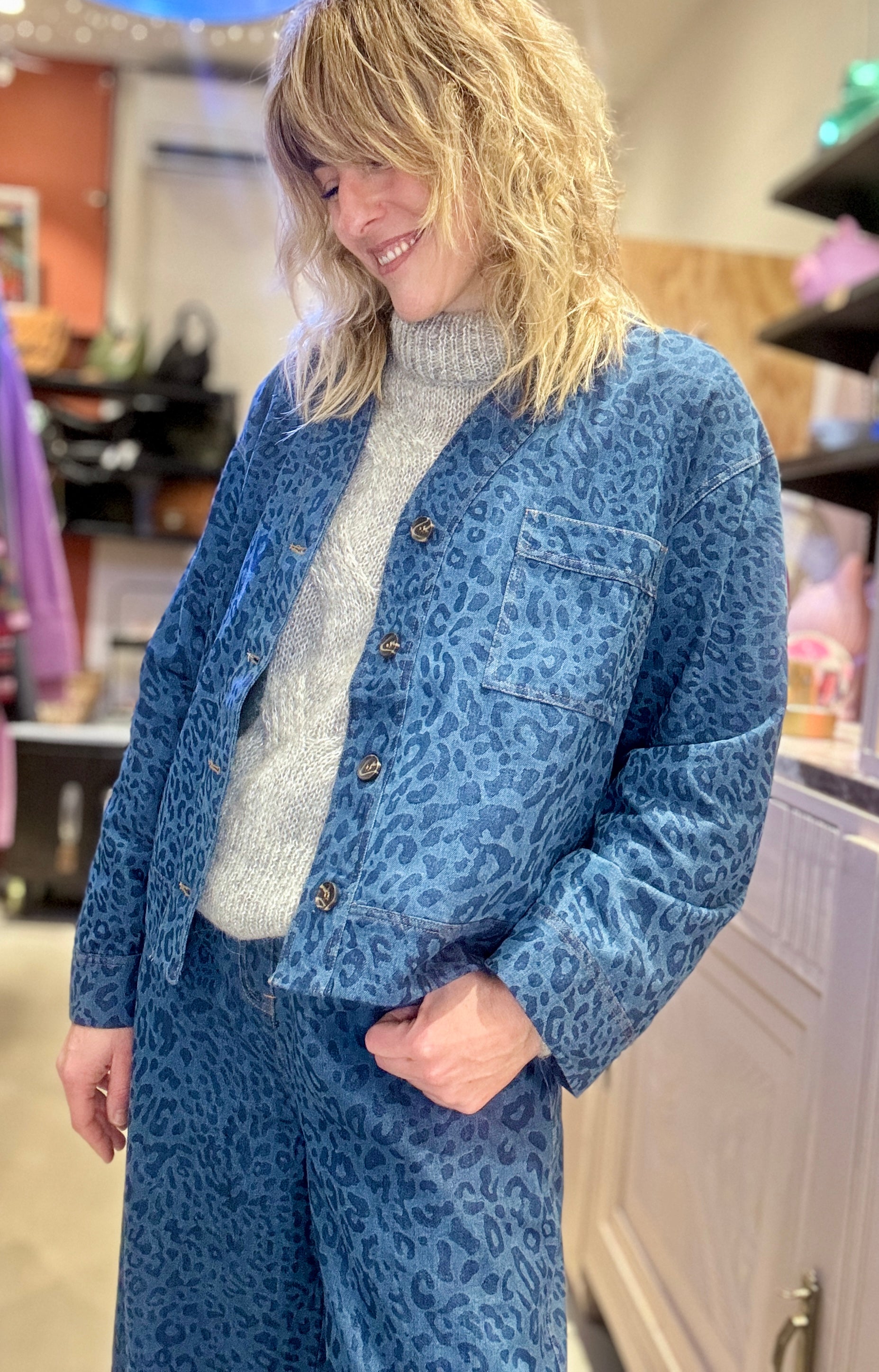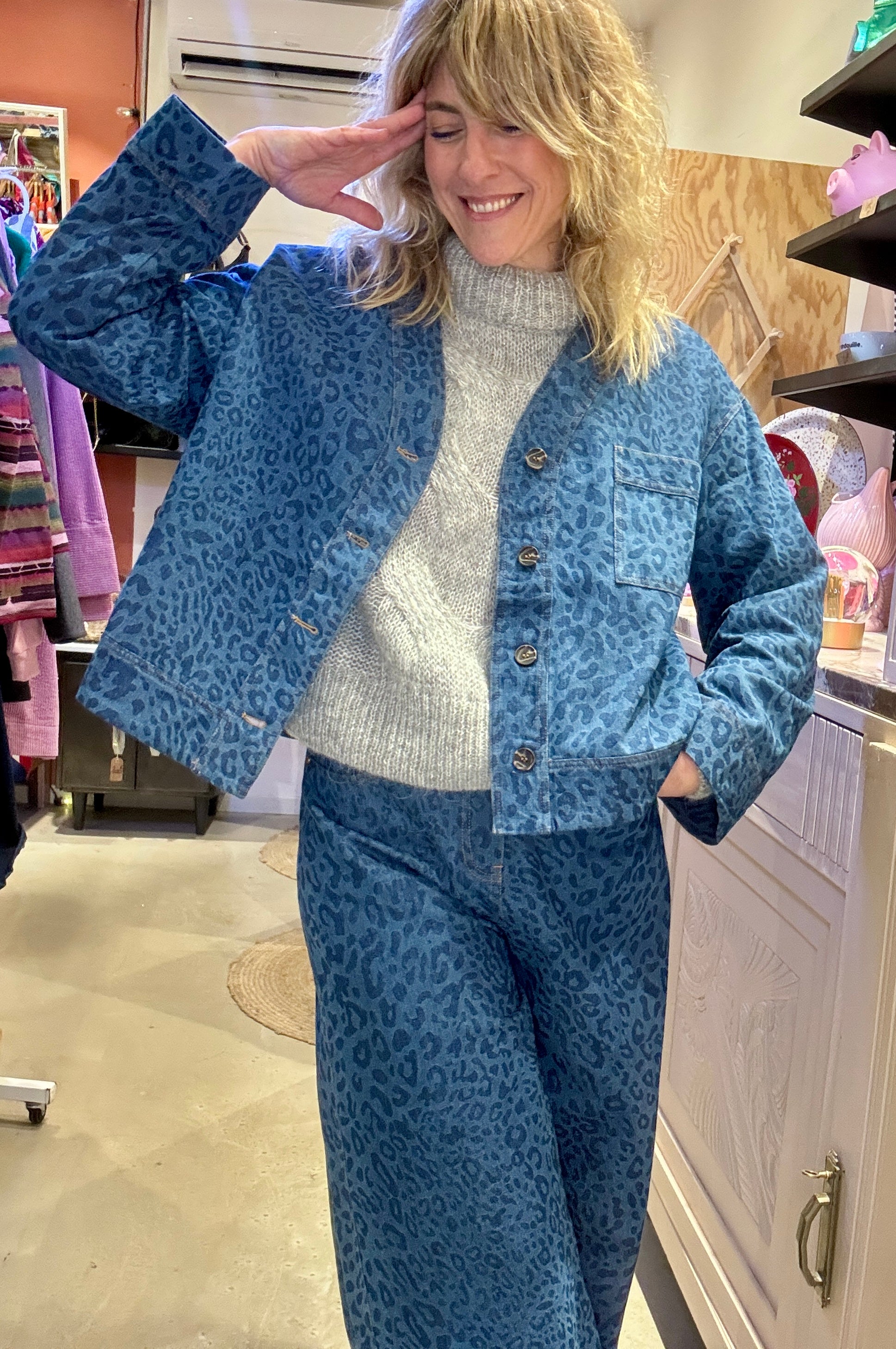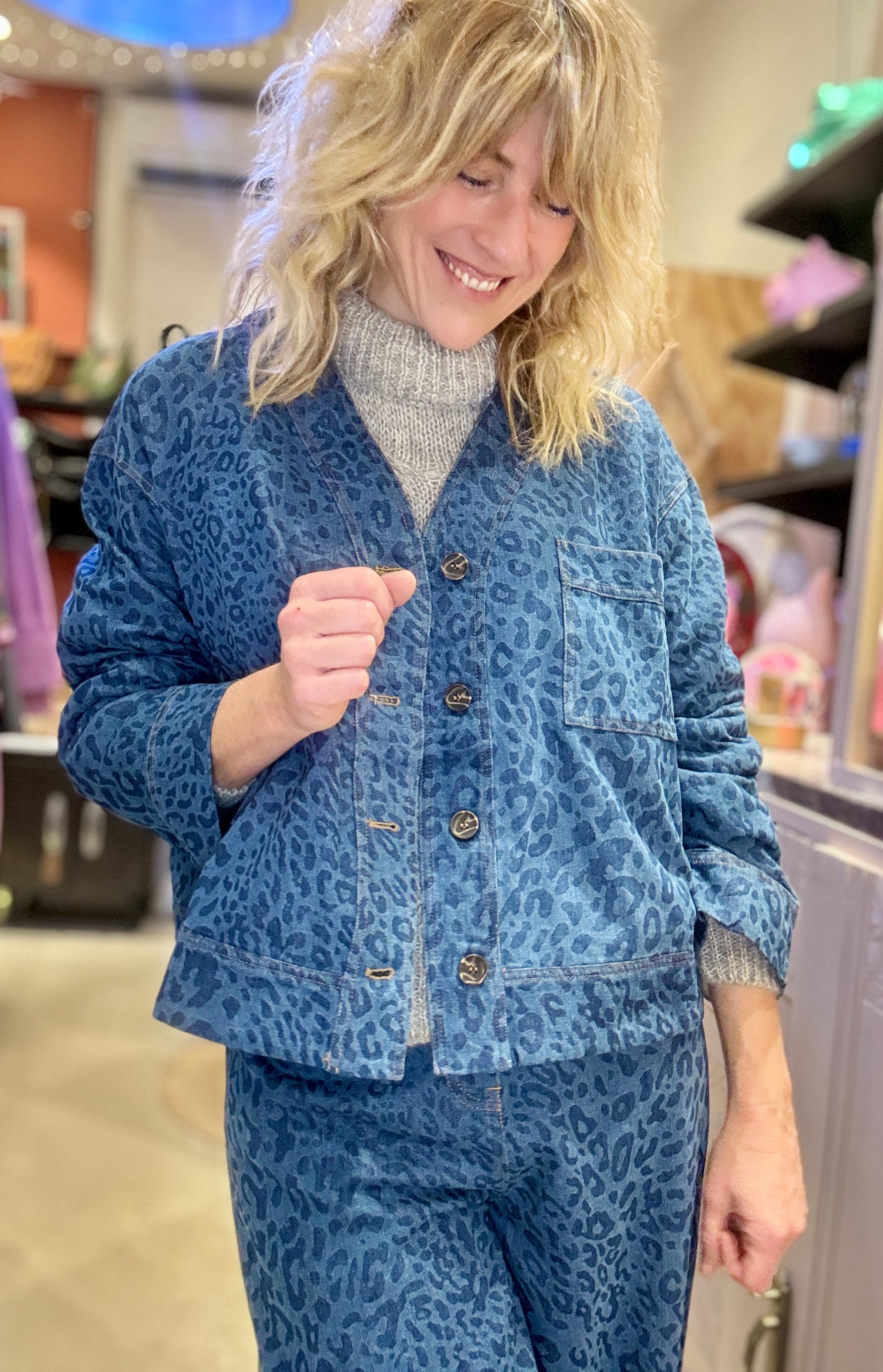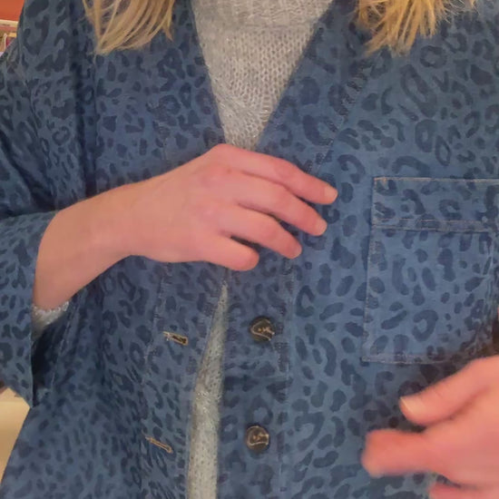 Veste canon à porter ouverte ou fermée ! En jean souple jacquard imprimé léopard.