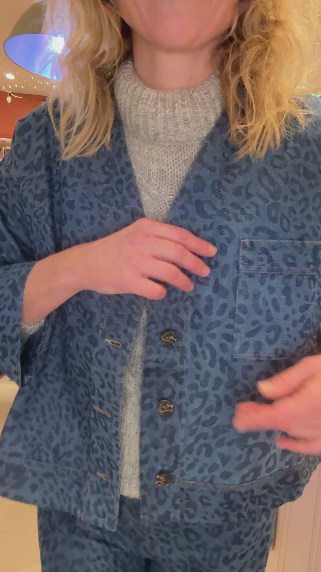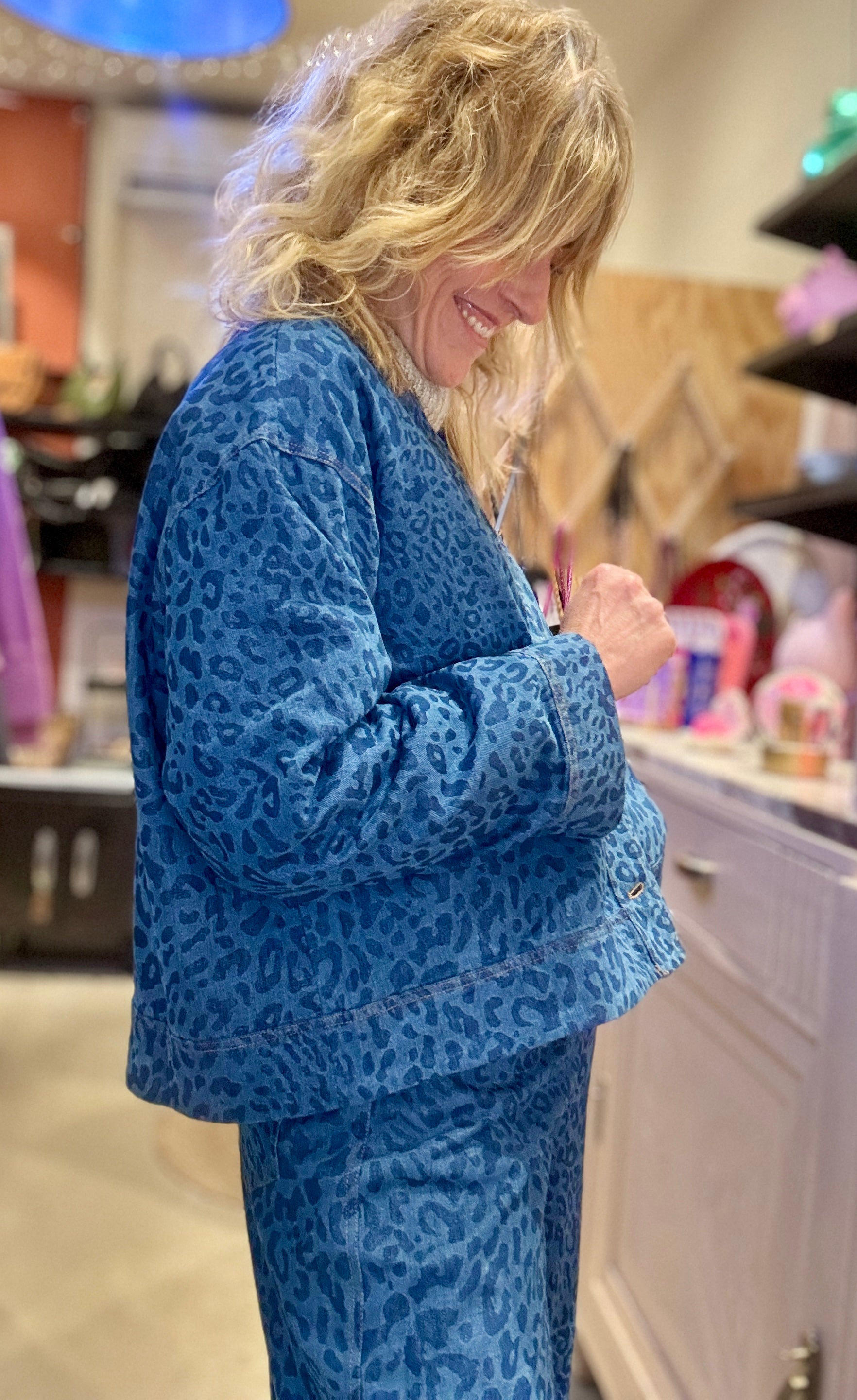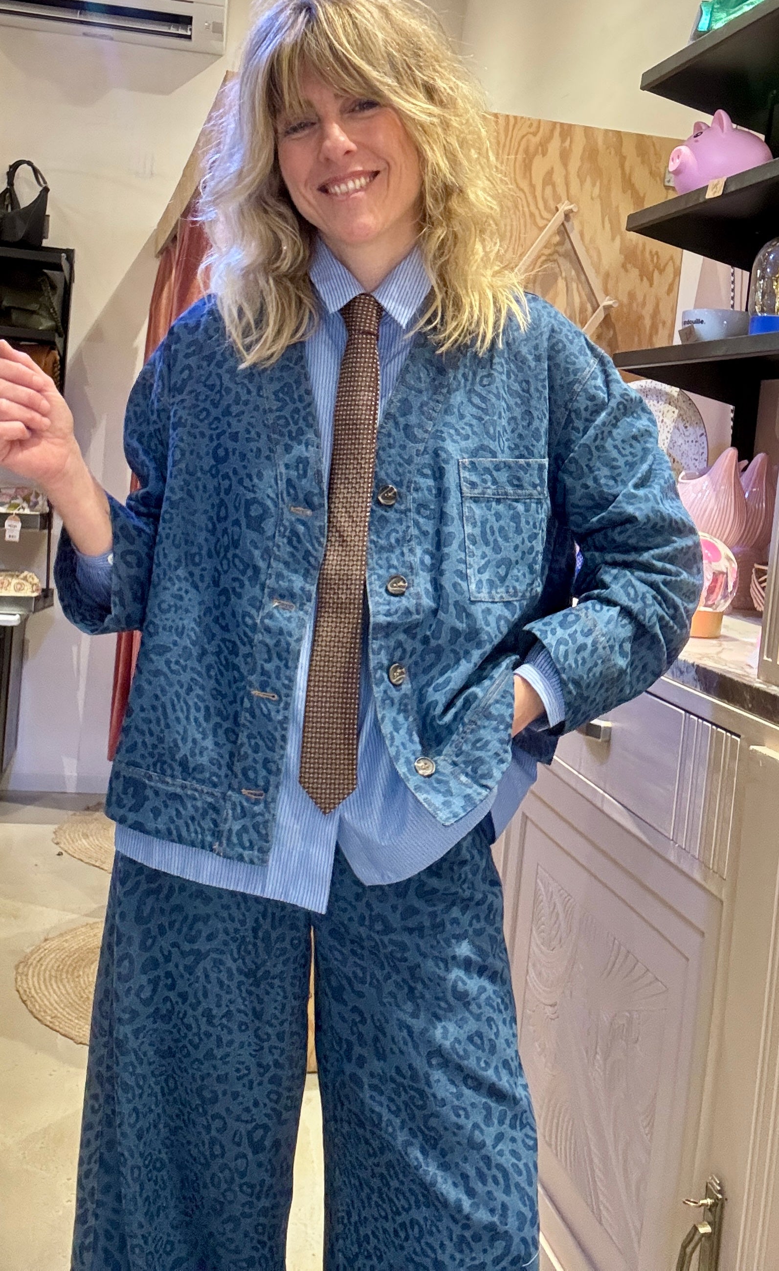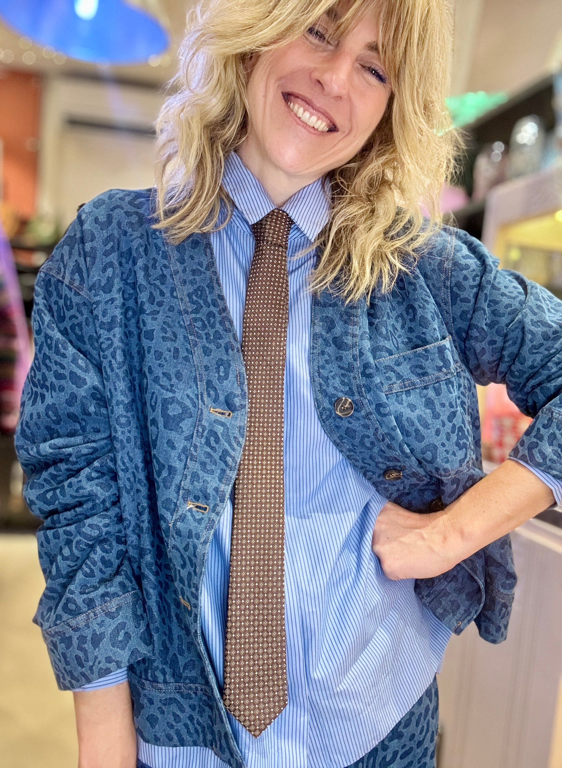 Veste canon à porter ouverte ou fermée ! En jean souple jacquard imprimé léopard.