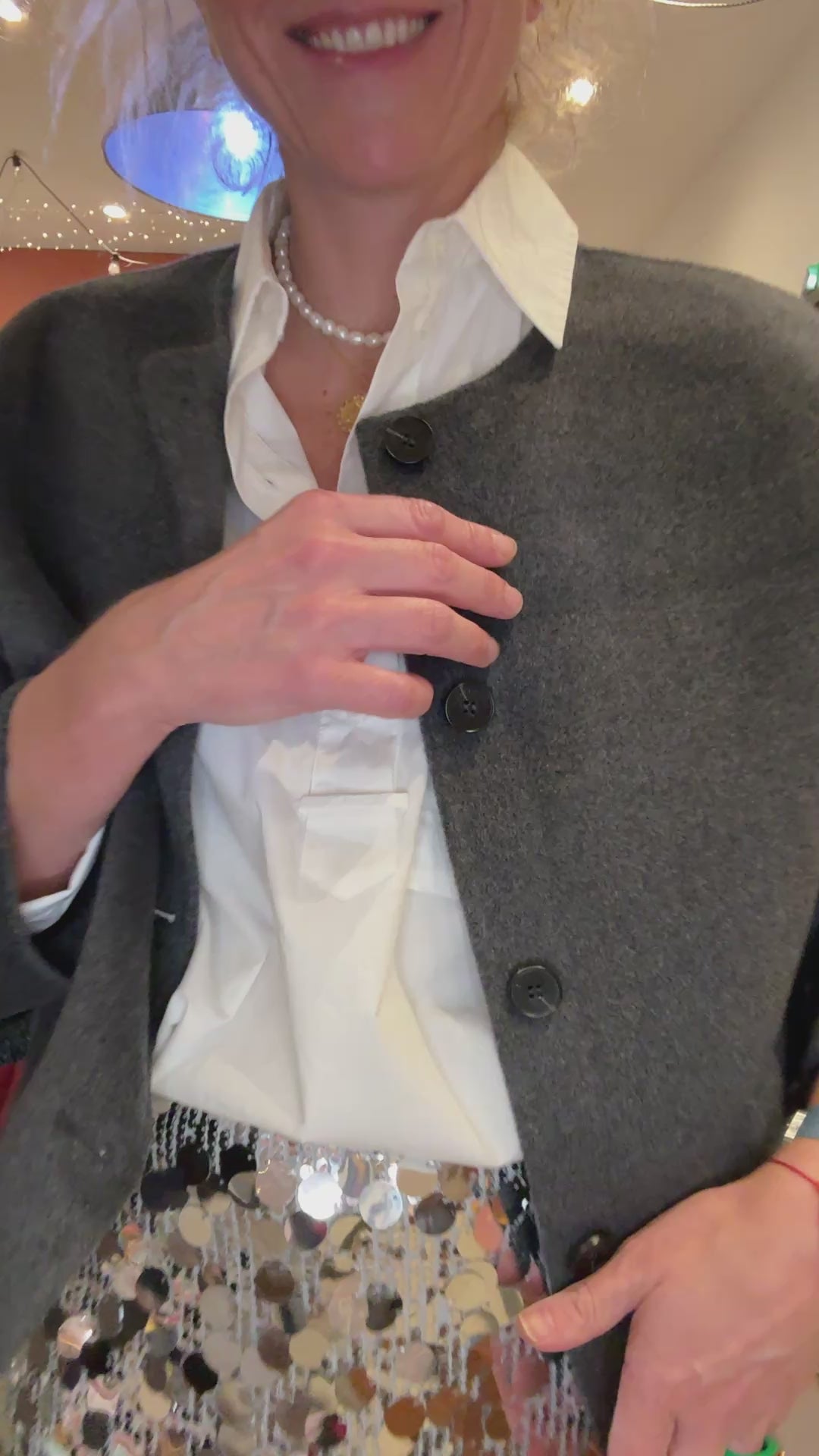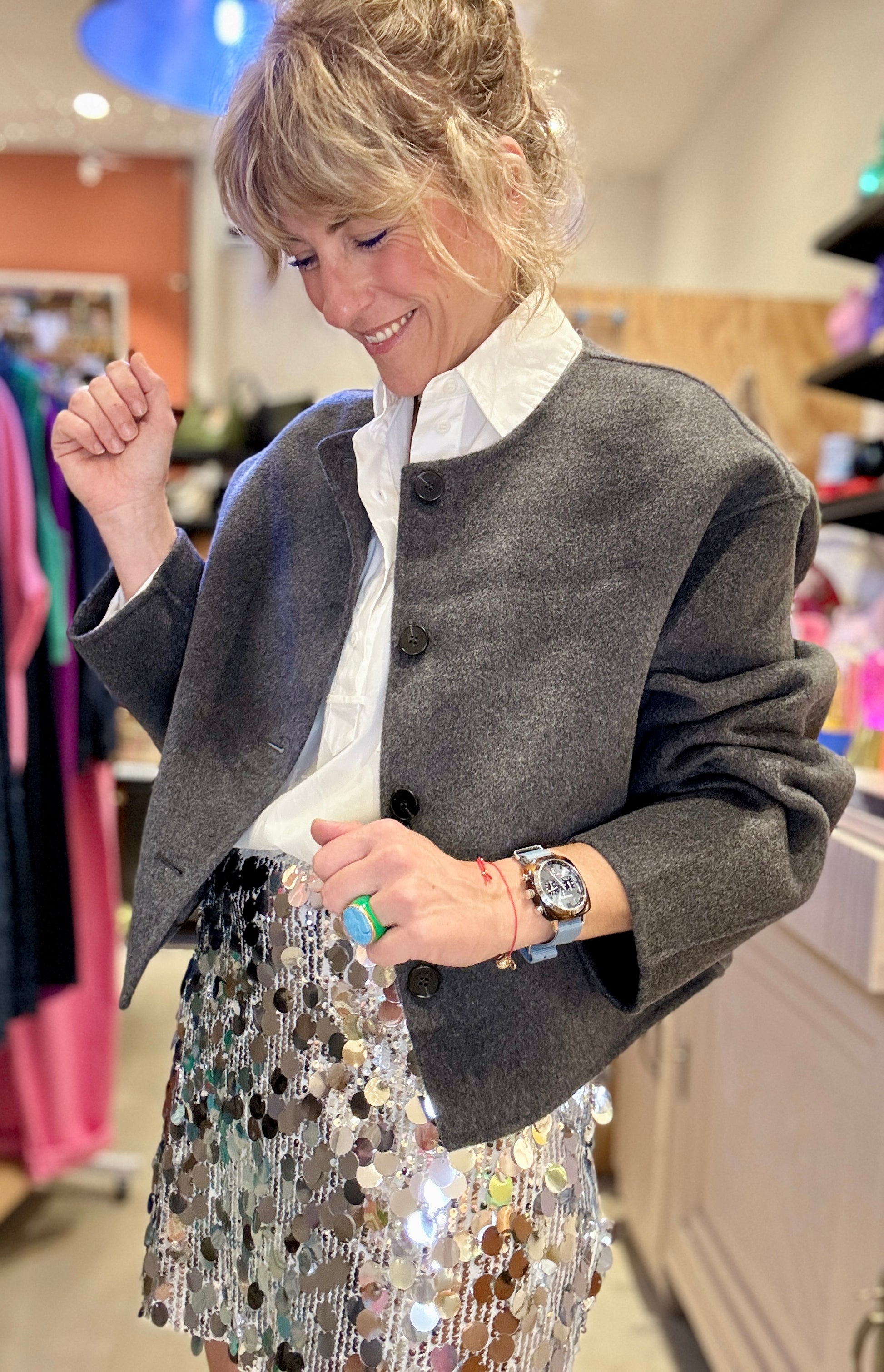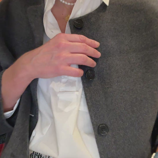 Col rond, larges manches et poches passepoilées sur les côtés.